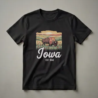 Iowans who appreciate the state's agricultural heritage and natural beauty will reach for this graphic tee. The design showcases a majestic bison grazing in a field of coneflowers, set against a backdrop of rolling, cultivated hills bathed in the warm glow of a sunset. Iowa, admitted to the Union in 1846, is known for its vast plains and fertile farmland, making this shirt a perfect representation of the state's identity. This t-shirt is a thoughtful gift for anyone who calls Iowa home, whether they live in Des Moines, Cedar Rapids, or are celebrating their heritage from afar. Wear this shirt to local festivals, farmers' markets, or casual outings to display your state pride. It's a comfortable and stylish way to connect with your roots and celebrate the Hawkeye State.