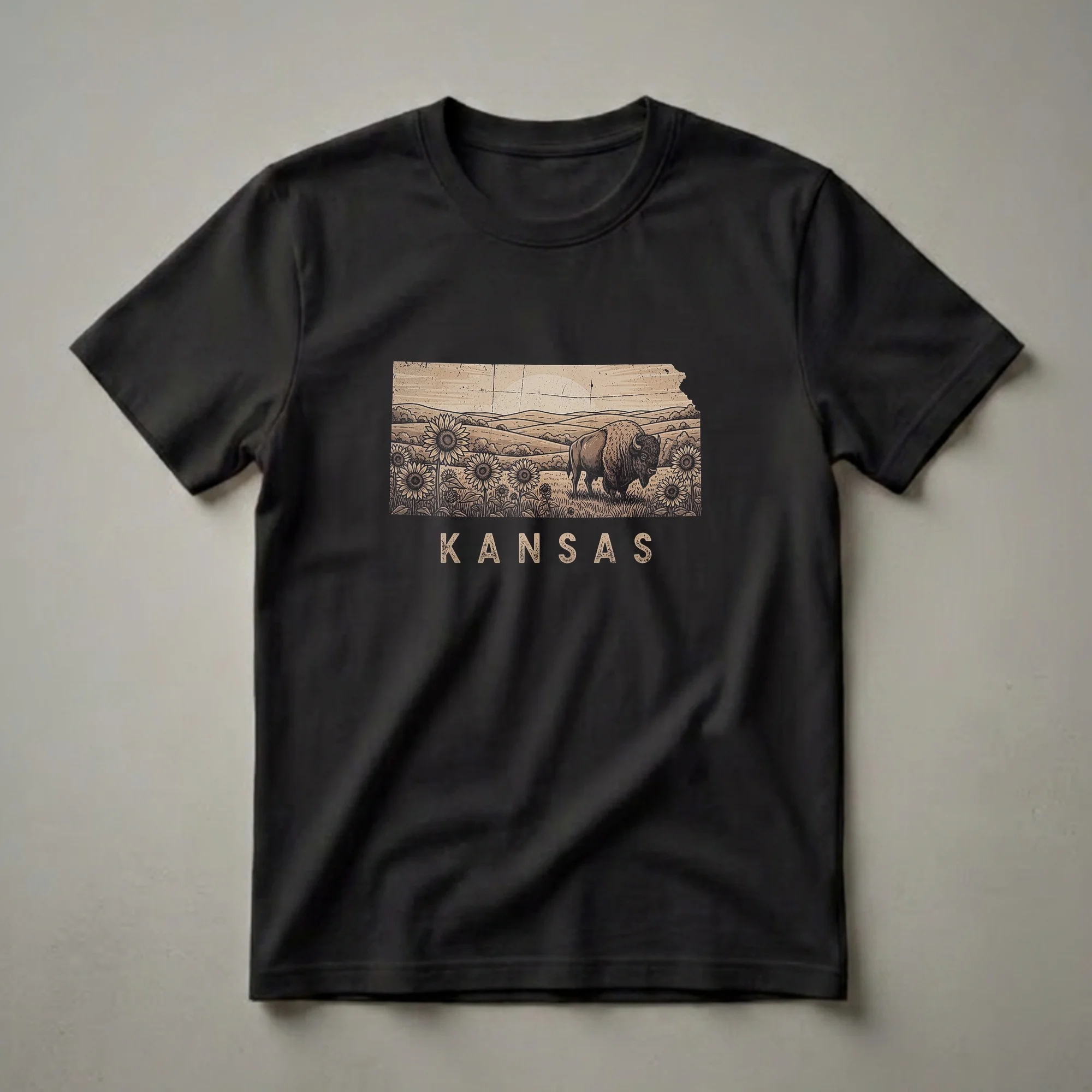 Kansas residents and admirers of the Sunflower State will appreciate this unique graphic tee. The design is rendered in a vintage, sepia-toned drawing style, showcasing the outline of Kansas filled with a picturesque prairie scene. Dominating the landscape is a majestic bison, a symbol of the American plains, standing amidst a field of blooming sunflowers. Rolling hills and a distant sun complete the idyllic vista, evoking the vast, open spaces characteristic of the central plains. Below the artwork, the word "KANSAS" is emblazoned in distressed, block lettering. This t-shirt works well for Kansans who want to display their state pride or for anyone who appreciates the natural beauty and heritage of the region. It makes a thoughtful gift for friends or family members who have a connection to Kansas, perhaps for a birthday or as a souvenir. Wear this shirt to local events, casual outings, or while exploring the scenic beauty of the state.