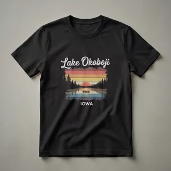 Lake Okoboji, a popular vacation destination in Iowa, is beautifully captured in this retro-inspired graphic tee. The design features a vibrant sunset with horizontal stripes in shades of orange, yellow, and red, reflecting on the calm water. Silhouetted pine trees frame the scene, adding a touch of nature's tranquility. In the foreground, a lone canoeist paddles across the lake, evoking a sense of peaceful adventure. Below the scenic vista, the word 'IOWA' is prominently displayed in a distressed font, anchoring the design to its Midwestern roots. This t-shirt is a thoughtful gift for anyone who cherishes memories of summer days spent by the lake, whether they are lifelong residents of the Iowa Great Lakes region or visitors seeking a memento of their travels. It's a staple in the collection for those who appreciate vintage aesthetics and the serene beauty of lakeside living. Wear this shirt to your next family gathering or casual outing, and let it spark conversations about your favorite Iowa getaway. The graphic tee offers a unique way to showcase your love for this picturesque Iowa landmark, making it a go-to tee for any occasion.