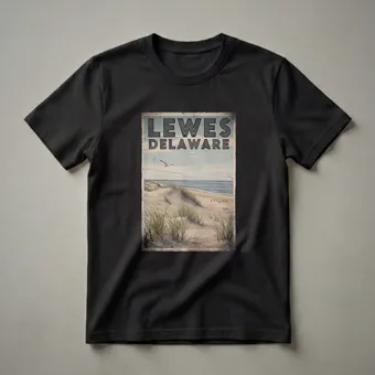 Lewes, Delaware, a charming coastal town, is beautifully captured in this retro graphic tee design. The artwork depicts a serene beach scene with rolling sand dunes covered in tall, green beach grass, leading down to the calm, blue ocean. Seagulls soar in the sky, adding a touch of coastal life to the vintage aesthetic. The words 'LEWES DELAWARE' are prominently displayed at the top in a bold, stylized font, evoking a classic travel poster feel. This t-shirt is a perfect way for anyone who has visited or lives in Lewes to showcase their connection to this historic Delaware beach town. It makes a thoughtful gift for travelers, beach enthusiasts, or anyone who appreciates vintage-inspired coastal art. Wear this shirt to remember your favorite beach vacation or to represent your hometown pride. This graphic shirt is a staple for any wardrobe, offering a unique blend of nostalgia and seaside charm.