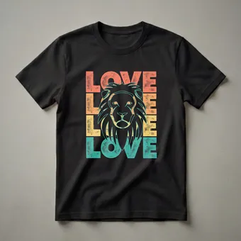 Animal lovers who appreciate the majestic presence of lions will reach for this striking graphic tee. The design showcases the word 'LOVE' stacked vertically, with a bold, stylized lion's head silhouette positioned centrally. Each letter of 'LOVE' is presented in a distinct, retro color, coral, orange, yellow, and teal, all featuring a distressed texture that evokes a vintage aesthetic. The lion's head itself is outlined in a contrasting teal, with internal details filled with the same retro color palette, creating an eye-catching visual. Lions, known as the 'king of the jungle,' are symbols of strength, courage, and royalty, making this shirt a powerful statement piece. This t-shirt works well for anyone who admires these magnificent big cats, whether they are drawn to their regal appearance or their social pride structure. It makes a thoughtful gift for birthdays, holidays, or just because for the lion enthusiast in your life. Wear this shirt to casual outings, to the zoo, or while relaxing at home, and let your love for these incredible animals shine through.