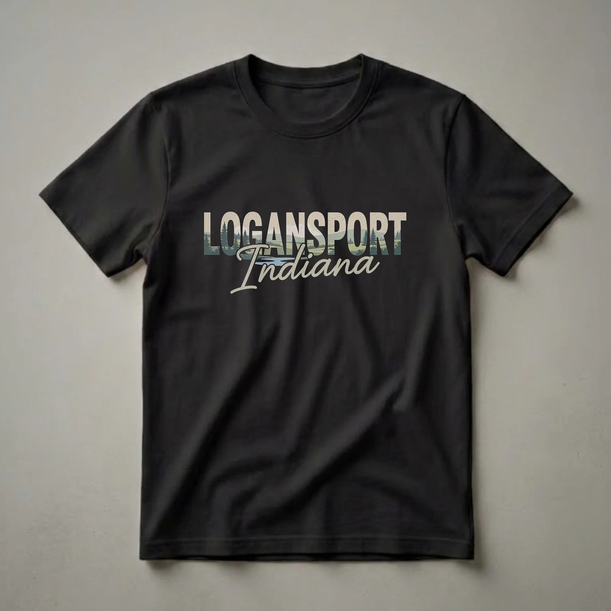 Logansport, Indiana residents and fans of the Midwest will appreciate this retro-inspired graphic tee. The design features the word "LOGANSPORT" in large, distressed block letters, filled with a scenic landscape. Within the letters, you can see rolling hills, evergreen trees, and a winding river, evoking a sense of natural beauty. Below "LOGANSPORT," the word "Indiana" is written in a flowing, script font, connecting the location to its state. This shirt works well for anyone who has a connection to Logansport, whether they grew up there, have family there, or simply enjoy the charm of Indiana towns. It’s a thoughtful gift for a birthday or holiday for the Hoosier in your life. Wear this comfortable t-shirt to local events, casual outings, or while exploring the outdoors. The design captures the essence of small-town America and the picturesque scenery found throughout Indiana. This tee is a great way to represent your hometown pride with a vintage aesthetic.