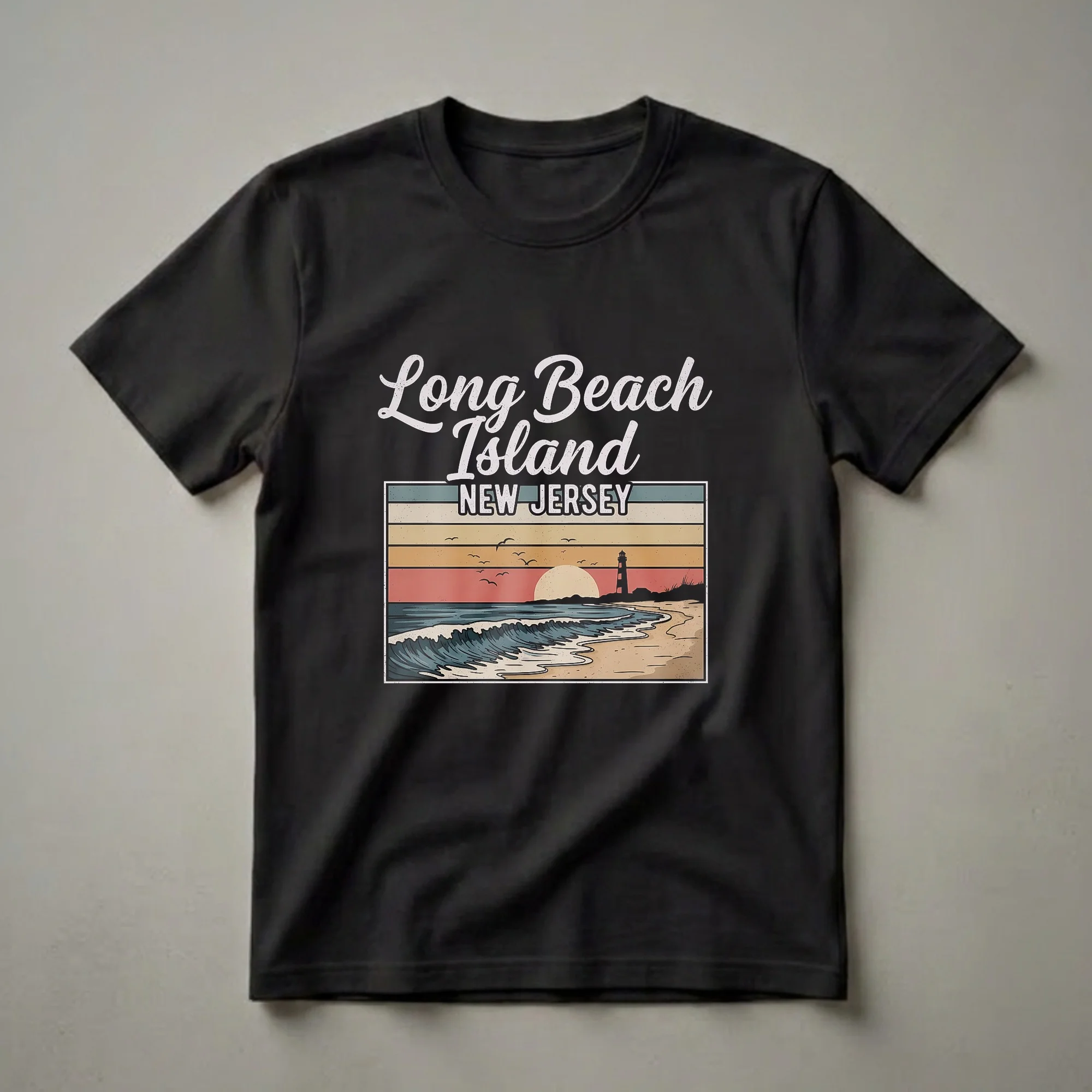 Long Beach Island, New Jersey, is a beloved summer destination known for its picturesque coastline and charming beach towns. This graphic tee captures the nostalgic spirit of LBI with a retro sunset design. The artwork showcases a serene beach scene, complete with rolling waves crashing onto the sandy shore, a silhouetted lighthouse standing guard, and a vibrant, striped sunset painting the sky. Seagulls fly overhead, adding to the coastal ambiance. The text "Long Beach Island" is rendered in a classic script font, with "NEW JERSEY" below in a bold, block style, all set against a backdrop of horizontal retro stripes in muted tones of teal, cream, orange, and red. This t-shirt is a perfect way for anyone who cherishes memories of the Jersey Shore to display their affection for this unique island. It makes a thoughtful gift for residents, vacationers, or anyone who dreams of the ocean breeze and the sound of the waves. Wear this shirt to the beach, on a casual outing, or while reminiscing about your favorite LBI moments.