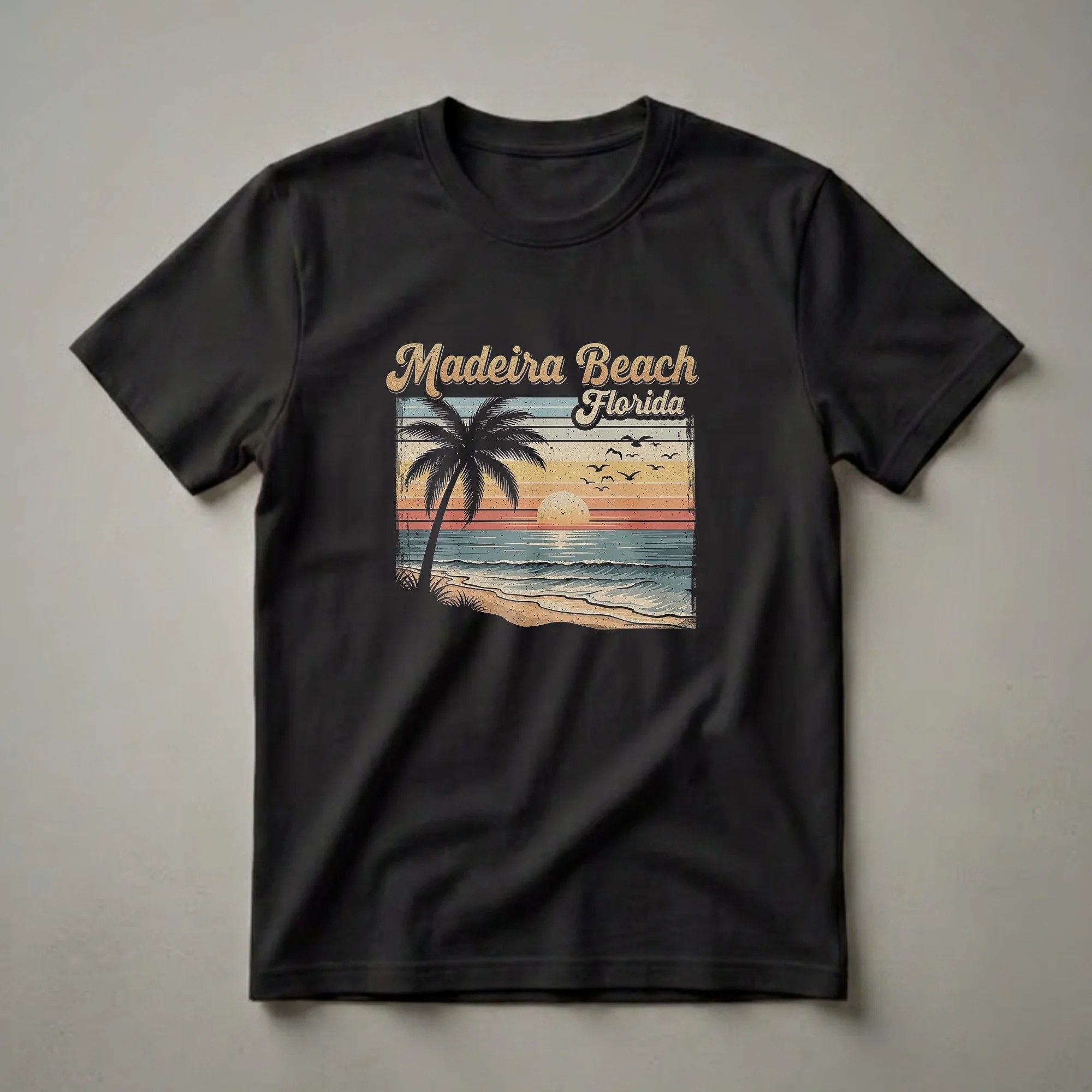 - Retro Madeira Beach Florida sunset graphic tee for beach lovers.