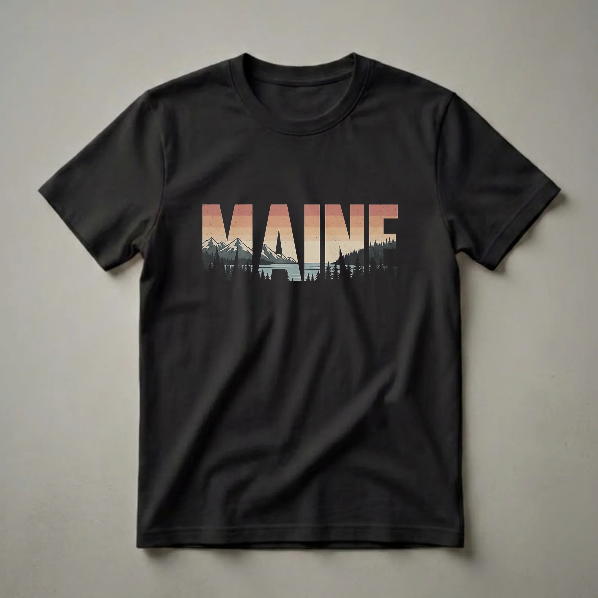 - Maine graphic tee showcasing a vintage mountain and lake landscape within the letters.