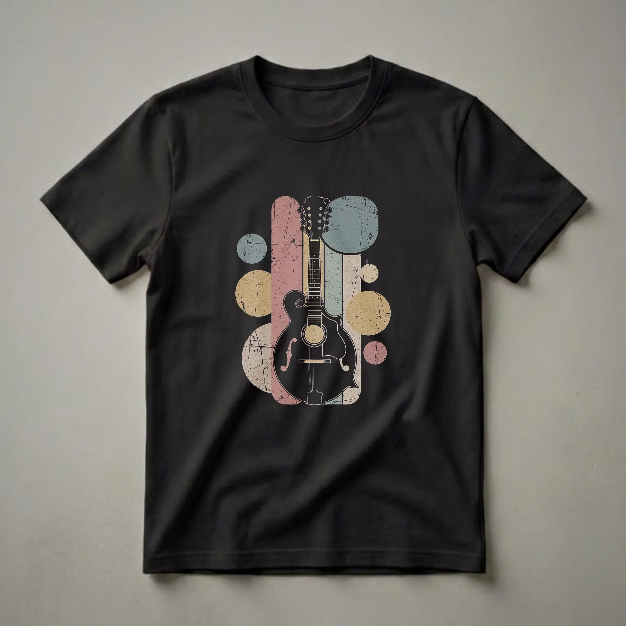 Musicians and music lovers will appreciate the vintage aesthetic of this mandolin graphic art tee. The design features a striking black silhouette of a mandolin, complete with its distinctive scrollwork and f-holes, set against a backdrop of distressed vertical stripes and scattered circles in muted pastel tones of pink, yellow, and teal. This visual style evokes a sense of nostalgia, reminiscent of mid-century graphic design. The mandolin, a stringed instrument in the lute family, is known for its bright, percussive tone and is often featured in folk, bluegrass, and country music genres. This shirt is a thoughtful gift for the mandolin player in your life, or for anyone who cherishes the rich heritage of stringed instruments. Wear this unique tee to jam sessions, music festivals, or casual outings to express your passion for music.