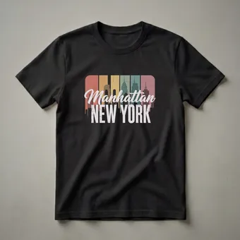 Manhattan New York residents and visitors who appreciate iconic cityscapes will reach for this graphic tee. The design features a stylized, retro-inspired skyline with tall buildings silhouetted against a backdrop of vertical stripes in muted, vintage colors like rust, ochre, teal, and dusty rose. The words "Manhattan" are written in a flowing, script-like font above "NEW YORK" in bold, distressed block letters. This shirt captures the essence of New York City's vibrant energy and architectural grandeur, reminiscent of classic travel posters. It's a thoughtful gift for anyone who has lived in or dreams of visiting the bustling streets of Manhattan. Wear this t-shirt to a casual outing, a trip to the city, or simply to showcase your urban pride. This apparel is a staple for those who feel a connection to the unique spirit of New York. The city's rich history and constant evolution make it a timeless subject for art and apparel.