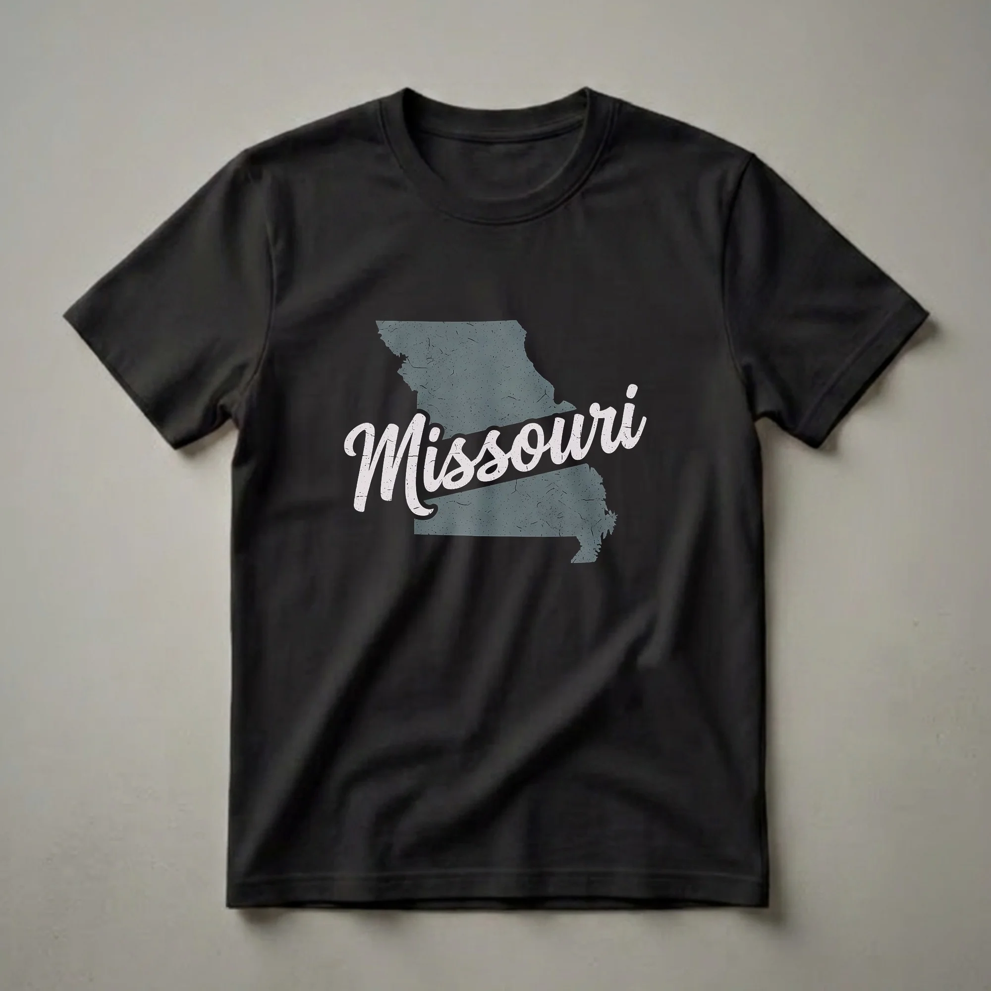 - Celebrate Missouri with this faded teal map outline tee, featuring a lovely script.