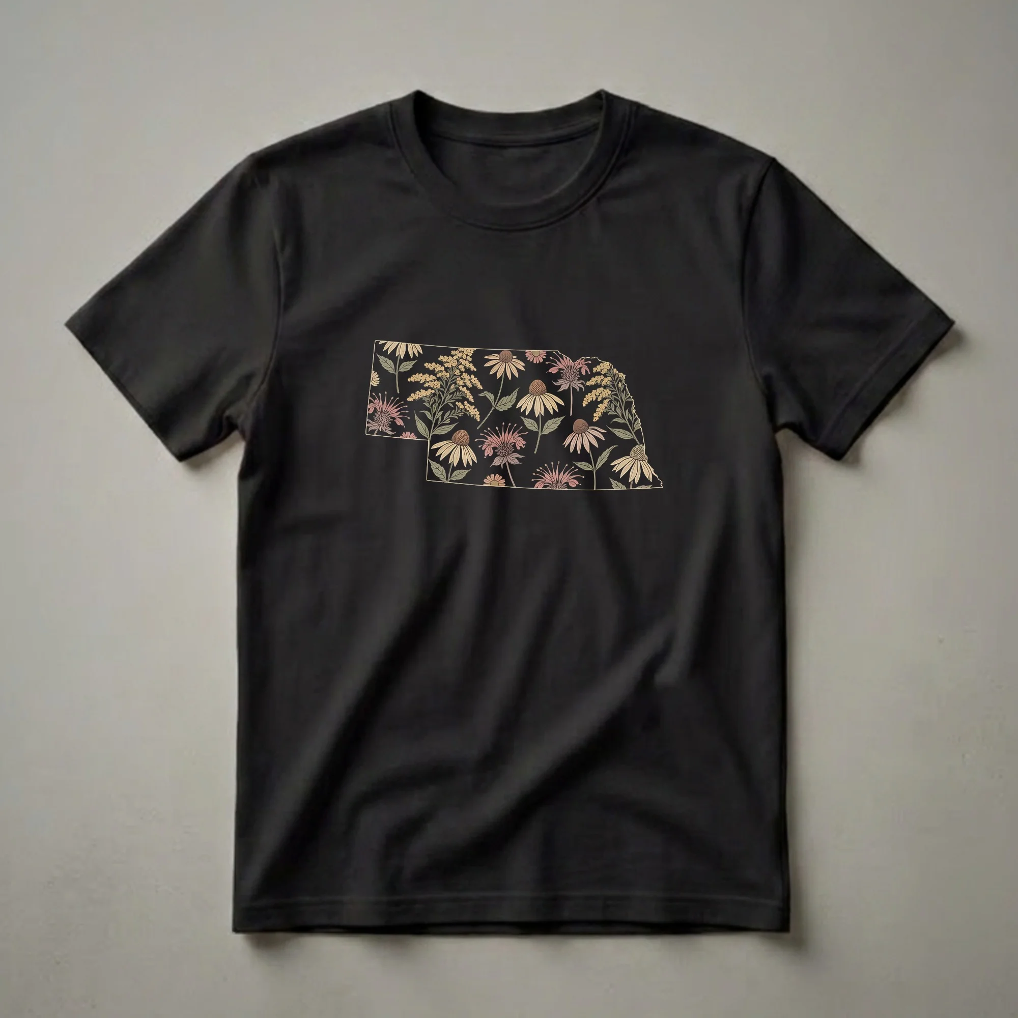 - Graphic t-shirt featuring a retro floral map of Nebraska.