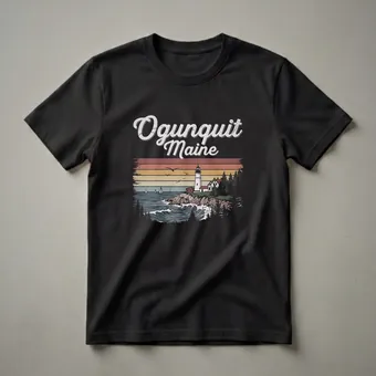 Ogunquit, Maine, a picturesque coastal town, is celebrated in this retro-inspired graphic tee. The design showcases a classic lighthouse standing tall on a rocky shore, overlooking the Atlantic Ocean. Waves crash against the rugged coastline, while sailboats dot the water in the distance. Pine trees frame the scene, adding to the quintessential New England coastal aesthetic. The text 'Ogunquit Maine' is emblazoned across the top in a distressed, vintage font, evoking a sense of nostalgia. This t-shirt is a perfect way for anyone who loves Ogunquit, whether they are a resident, a frequent visitor, or simply appreciate the beauty of the Maine coast, to express their connection to this charming location. It makes a thoughtful gift for friends or family who have fond memories of Ogunquit. Wear this shirt to a casual outing, a beach day, or while reminiscing about coastal adventures. The design captures the essence of Maine's iconic lighthouses and its stunning seaside landscapes, making it a unique piece of apparel for any wardrobe.