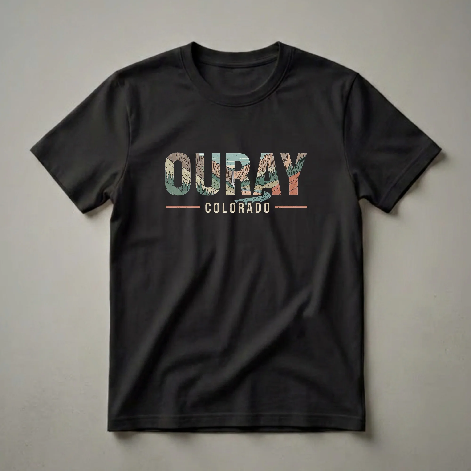 Ouray, Colorado, nestled in the San Juan Mountains, is a town renowned for its dramatic scenery and outdoor adventures. This graphic tee captures the essence of the region with a retro-inspired design that fills the word "OURAY" with a vibrant mountain landscape. You can see towering cliffs, lush pine forests, a cascading waterfall, and a winding river, all rendered in a vintage color palette. Below the main graphic, "COLORADO" is clearly displayed, anchoring the design to its state. This shirt is a thoughtful gift for anyone who has visited Ouray, dreams of exploring the San Juan Mountains, or simply appreciates the rugged beauty of the American West. It's a go-to tee for hikers, climbers, or anyone who loves the Colorado outdoors. Wear this tee on your next trip to the mountains, to a casual gathering, or while reminiscing about your adventures in this picturesque Colorado town. It serves as a constant reminder of the breathtaking vistas and the spirit of exploration that Ouray embodies.