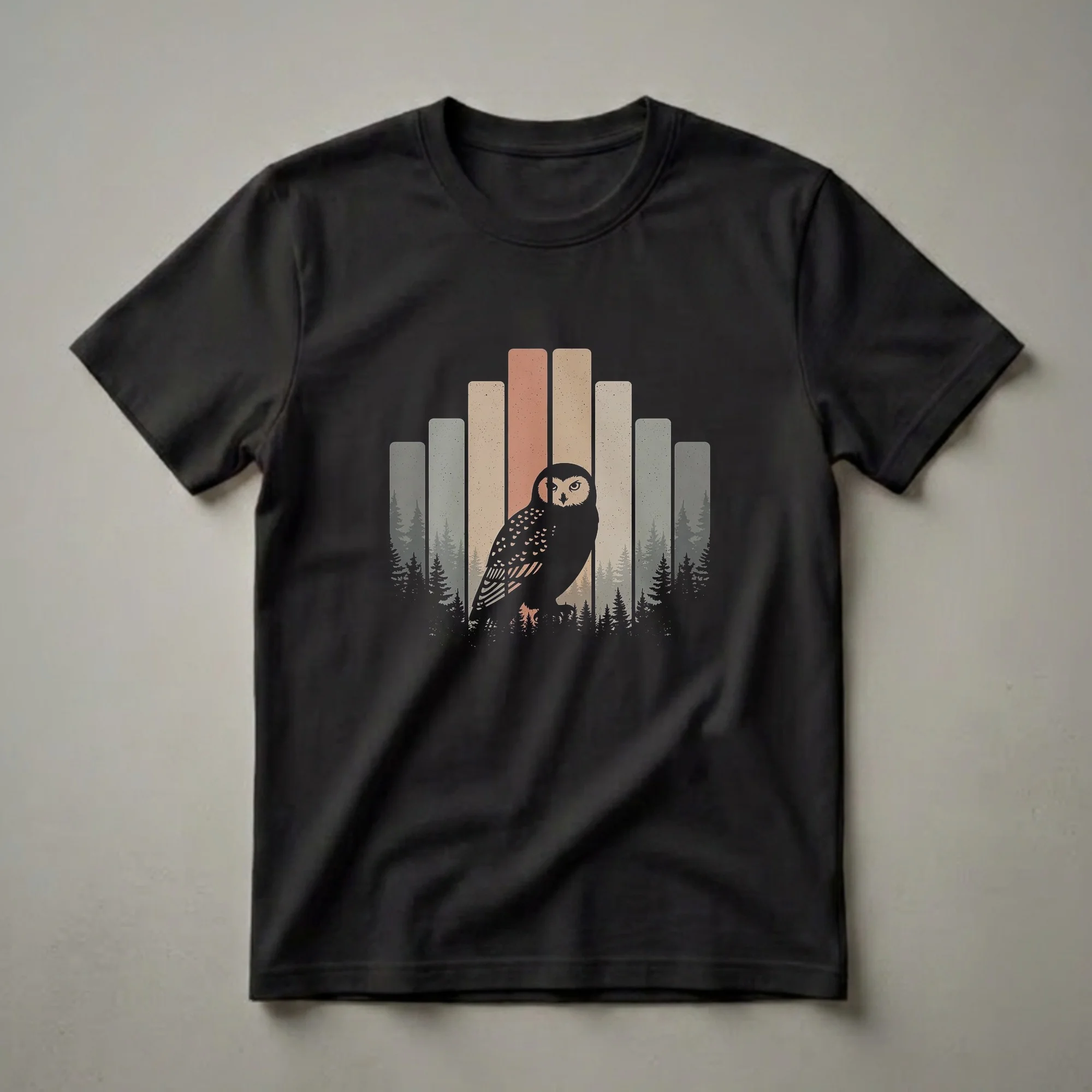Nature lovers and wildlife enthusiasts will appreciate this striking graphic tee featuring a detailed owl illustration. The design showcases a majestic owl perched amidst a dense forest of pine trees, set against a backdrop of retro-inspired vertical stripes in muted, earthy tones of grey, beige, and rust. Owls, known for their nocturnal habits and keen eyesight, are fascinating creatures that inhabit forests worldwide. This shirt captures the serene beauty of their natural habitat, making it a go-to tee for anyone who cherishes the wilderness. The vintage aesthetic of the striped background evokes a sense of nostalgia, reminiscent of classic outdoor adventure posters. This t-shirt is a thoughtful gift for birdwatchers, hikers, or anyone who finds solace in the quiet majesty of the woods. Wear it on your next nature walk, to a casual gathering, or simply when you want to carry a piece of the wild with you. This apparel is a unique way to express your connection to the natural world and its captivating inhabitants.