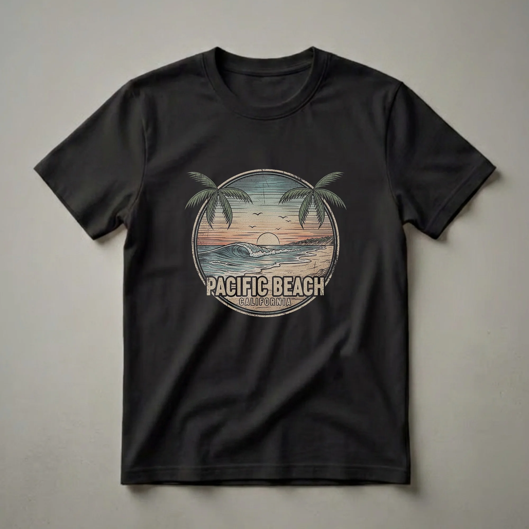 - Retro Pacific Beach California graphic tee for beach lovers.