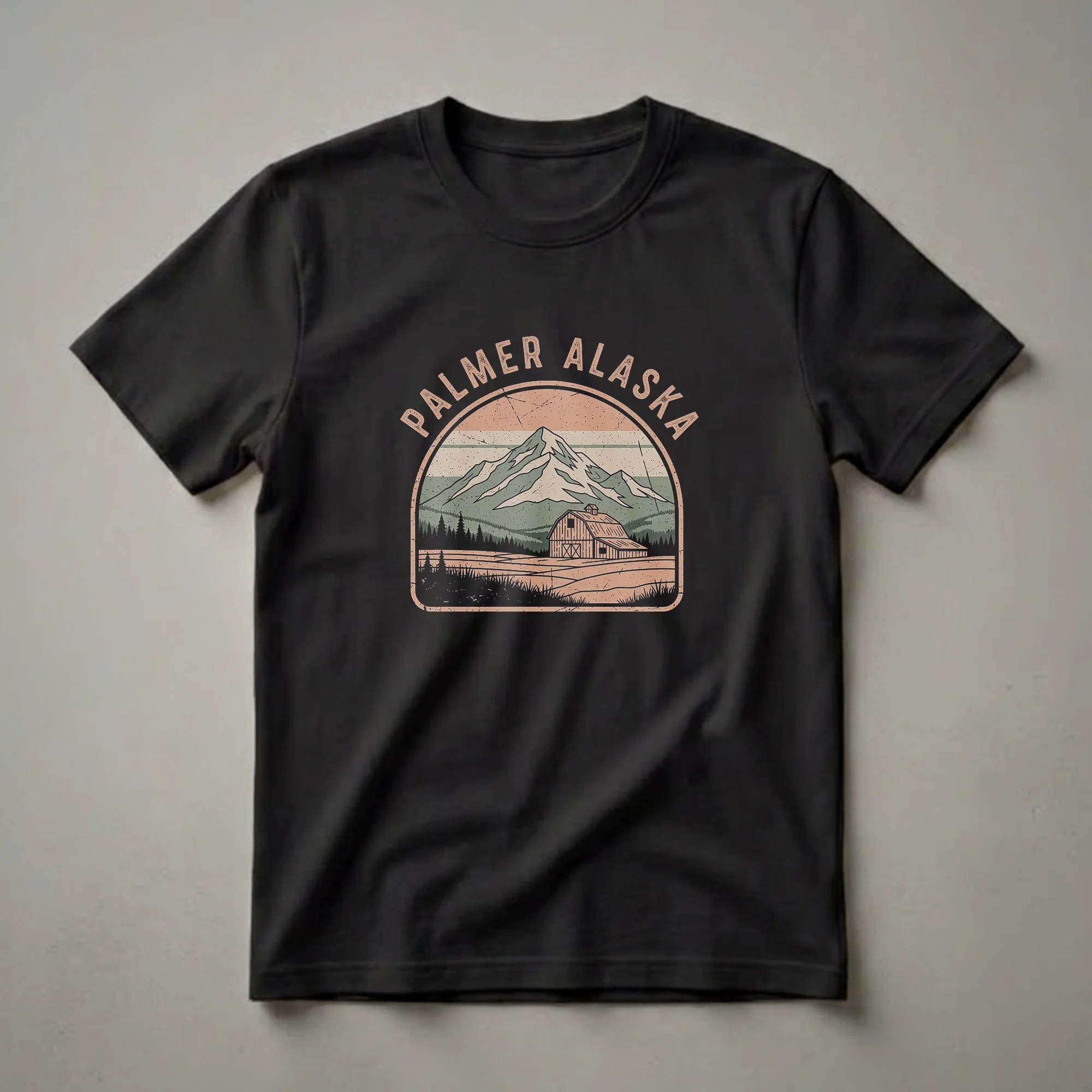 Palmer, Alaska, a city nestled in the Matanuska-Susitna Valley, is celebrated with this vintage-inspired graphic tee. The design captures the essence of the Alaskan landscape, featuring a rustic barn set against a backdrop of majestic, snow-capped mountains and dense evergreen forests. The scene evokes the spirit of the Last Frontier, a place known for its rugged beauty and pioneering heritage. Palmer itself is a hub for agriculture, famously hosting the Alaska State Fair, and this shirt reflects that connection to the land with its depiction of a classic barn and rolling fields. This t-shirt is a perfect way for residents and visitors to express their appreciation for the unique charm of Palmer and the broader Alaskan wilderness. It makes a thoughtful gift for anyone who cherishes the wild spirit and natural splendor of Alaska, or for those who have a special connection to the Mat-Su Valley. Wear this shirt to embrace your Alaskan pride, whether you're exploring the outdoors or reminiscing about your favorite Alaskan memories.
