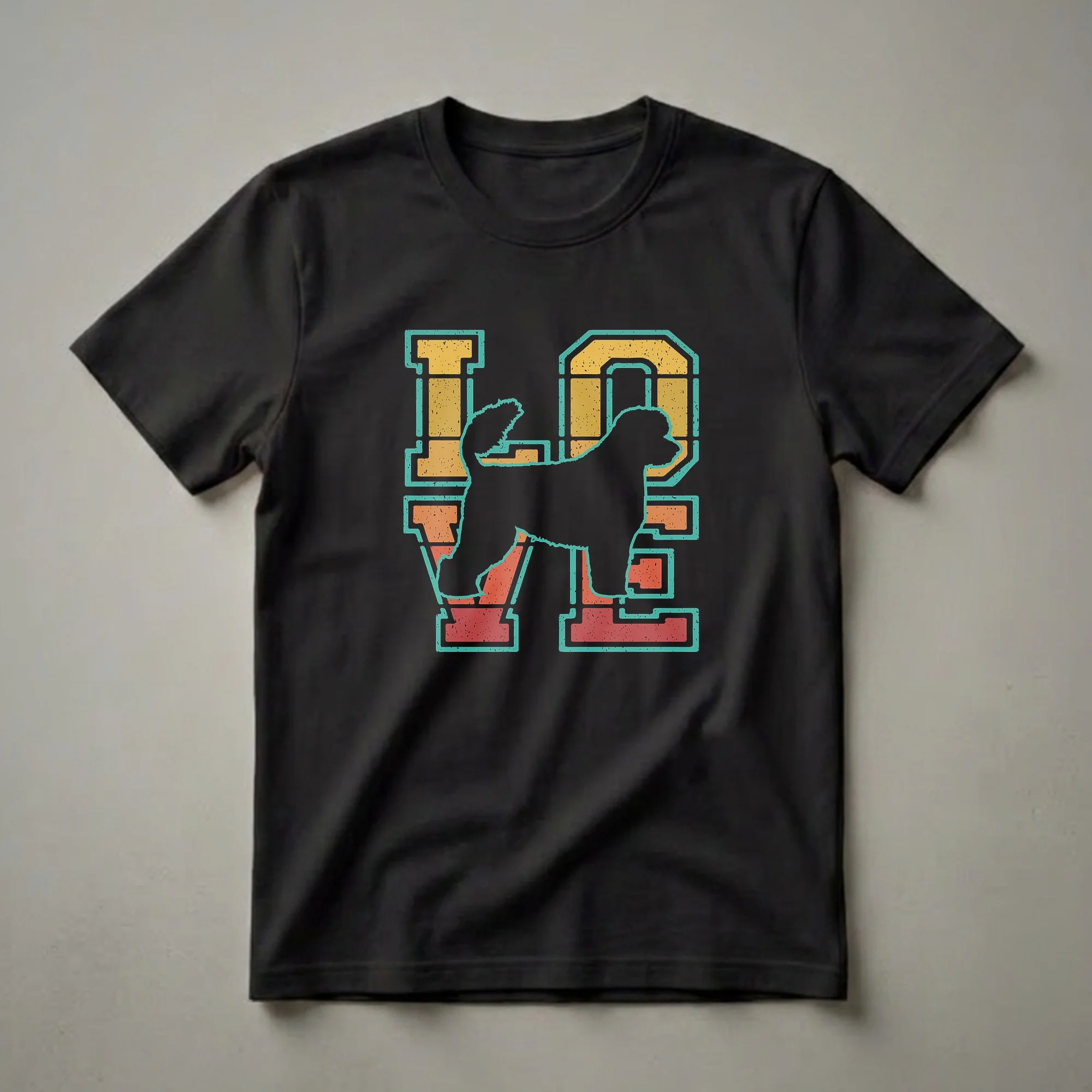 Portuguese Water Dog owners who want to showcase their affection for their beloved canine companions will reach for this retro-themed t-shirt. The design features the word 'LOVE' in a distressed, vintage style, with the silhouette of a Portuguese Water Dog artfully placed within the 'O'. This striking graphic tee celebrates the unique bond between people and their PWDs, known for their intelligence, energy, and distinctive curly or wavy coats. Portuguese Water Dogs originated from the Algarve region of Portugal, historically serving as assistants to fishermen by retrieving lost tackle and herding fish into nets. This shirt makes a thoughtful gift for any Portuguese Water Dog mom or dad, or for someone celebrating a birthday who adores this versatile breed. Wear it to your next dog park visit or casual outing to spark conversations with fellow dog lovers.