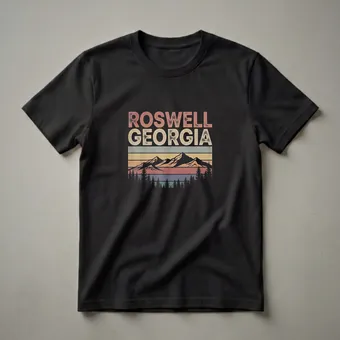 Roswell, Georgia residents and visitors who appreciate a touch of vintage flair will reach for this unique graphic tee. The design showcases the city name, "ROSWELL GEORGIA," in a distressed, retro font, layered over a vibrant, striped sunset. Below the text, a silhouette of a mountain range emerges from the colorful bands, backed by a dense line of pine trees. This visual evokes a sense of adventure and natural beauty, reminiscent of the landscapes found in parts of the southeastern United States, even though Roswell itself is known more for its historic district and Chattahoochee River access. The state of Georgia is characterized by its diverse geography, ranging from the Appalachian Mountains in the north to coastal plains. This shirt serves as a stylish reminder of home or a cherished travel destination. It makes a thoughtful gift for anyone with a connection to Roswell, whether they are a long-time resident, a former student, or simply someone who enjoys the charm of this northern Atlanta suburb. Wear this t-shirt to casual outings, exploring local attractions, or while reminiscing about Georgia's scenic beauty.