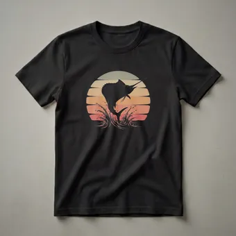 Sailfish enthusiasts will appreciate this striking graphic tee that captures the power and grace of these magnificent ocean predators. The design features a bold, black silhouette of a sailfish leaping dramatically from stylized waves. Behind the fish, a retro-style sunset is depicted with horizontal bands of color, transitioning from a deep red at the bottom through orange and yellow to a muted green at the top, evoking a vintage aesthetic. Sailfish, known for their incredible speed and the distinctive sail-like dorsal fin, are found in tropical and warm temperate oceanic waters worldwide. They are highly prized game fish, often targeted by sport anglers for their challenging fight. This t-shirt is a thoughtful gift for any angler who dreams of the thrill of the catch or for anyone who admires the beauty of marine wildlife. Wear this shirt on your next fishing trip, to a casual gathering, or simply as a statement piece that celebrates the ocean's wonders. It's a staple in the collection for those who love the sea.