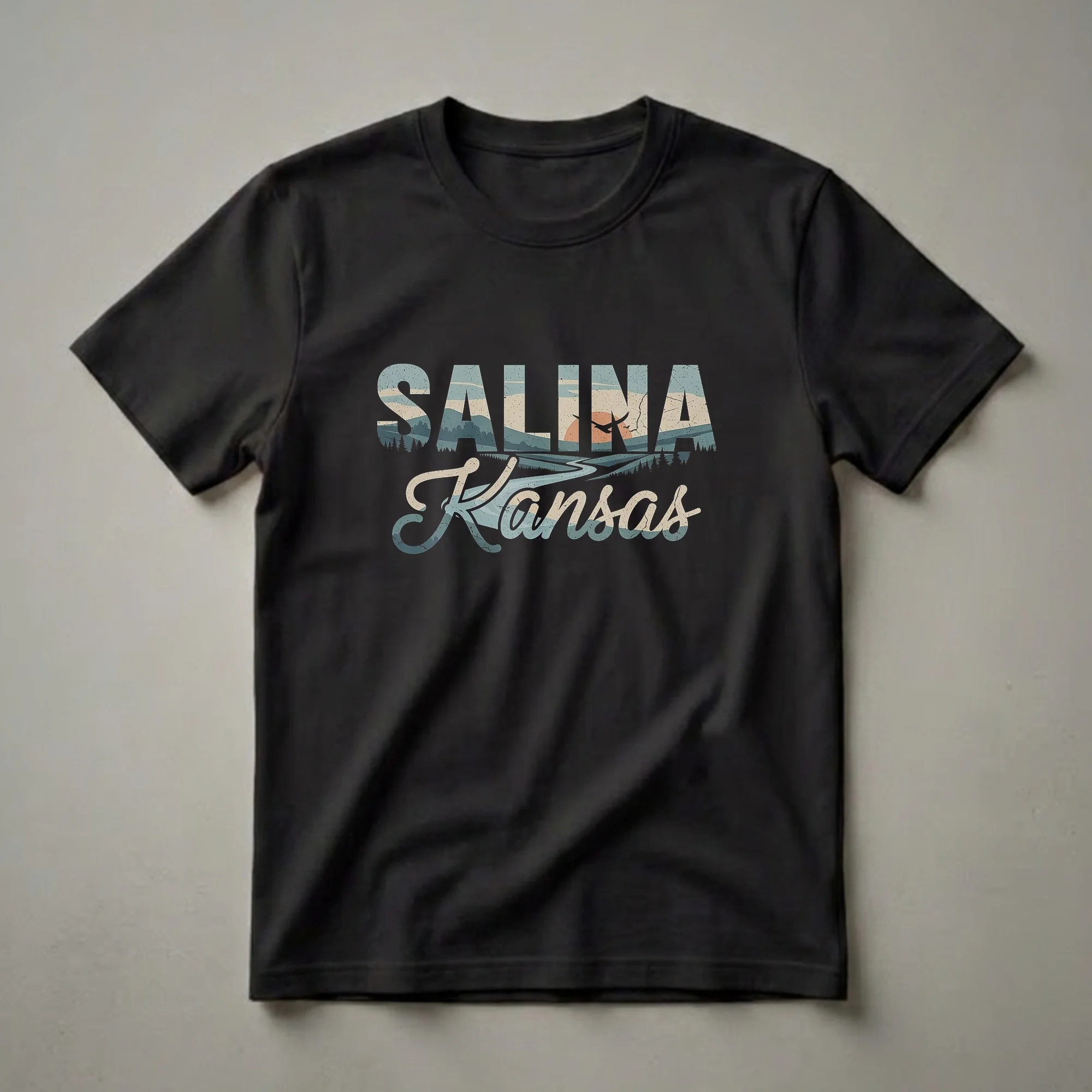 - Salina, Kansas residents can display their city pride with this retro landscape tee.