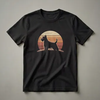 - Features a retro sunset graphic with a Scottish Terrier silhouette.
