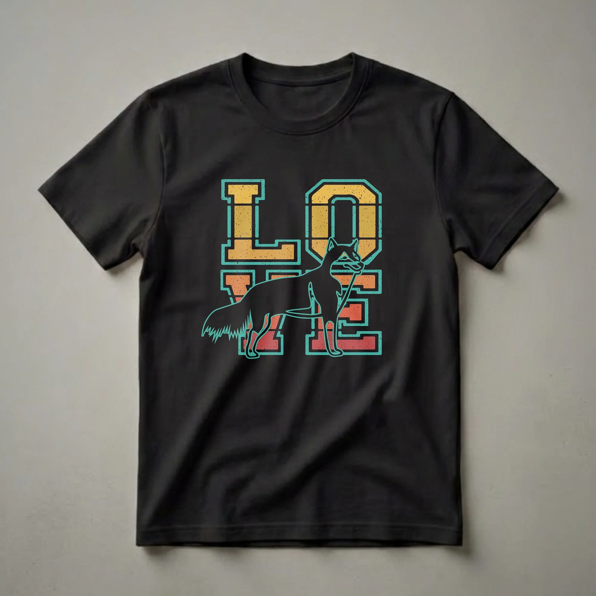 - Features a retro 'LOVE' graphic with a Siberian Husky silhouette.