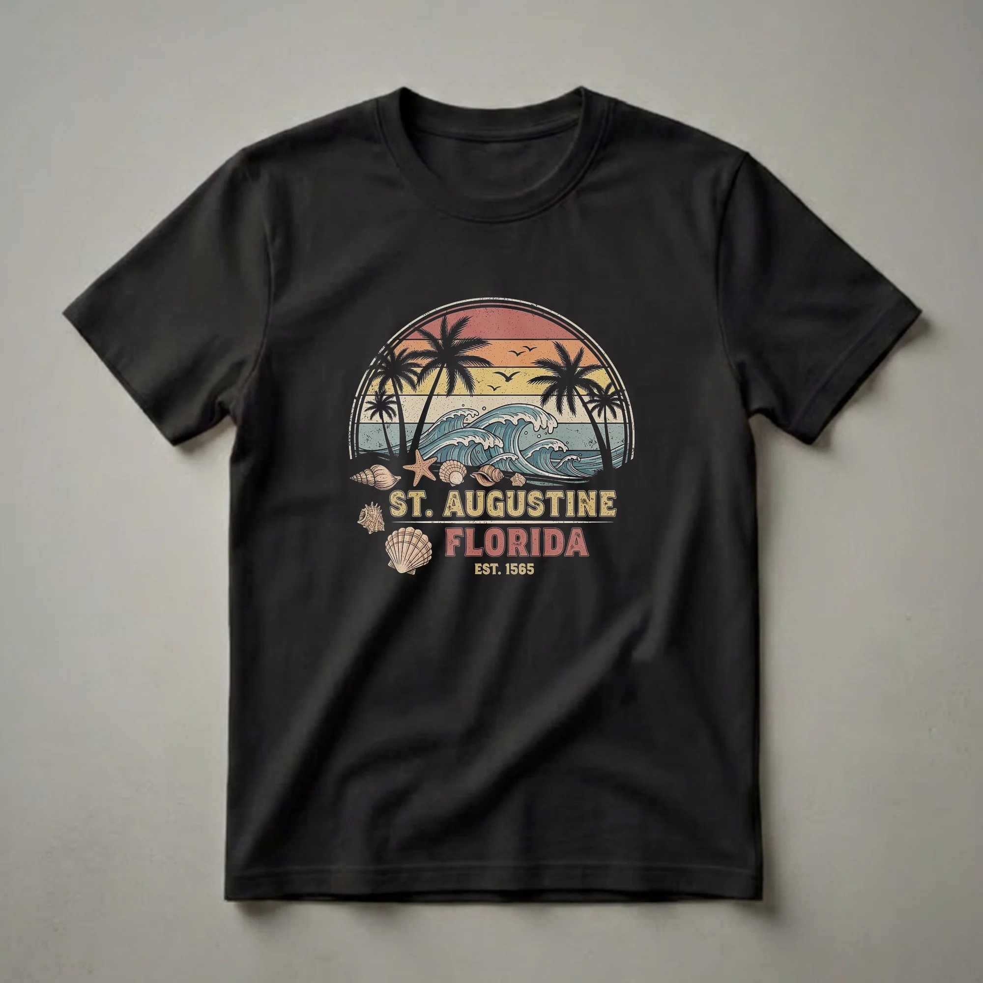 St. Augustine, Florida, the nation's oldest continuously inhabited European-established settlement, offers a unique blend of history and coastal beauty. This graphic tee captures that essence with a striking retro design. The artwork features a vibrant sunset with layered colors of red, orange, and yellow, framed by a distressed arch. Silhouetted palm trees stand tall against the horizon, while dynamic ocean waves crash onto the shore. Scattered seashells and a starfish add a touch of beachcomber charm to the foreground. The text prominently displays "ST. AUGUSTINE FLORIDA EST. 1565," grounding the design in its historical significance. This t-shirt is a thoughtful gift for anyone who has visited or dreams of visiting the historic streets and beautiful beaches of St. Augustine. It's a go-to tee for casual outings, beach days, or simply reminiscing about Florida adventures. Wear it to explore the historic sites or enjoy a sunny day by the coast, showcasing your love for this iconic Florida destination.