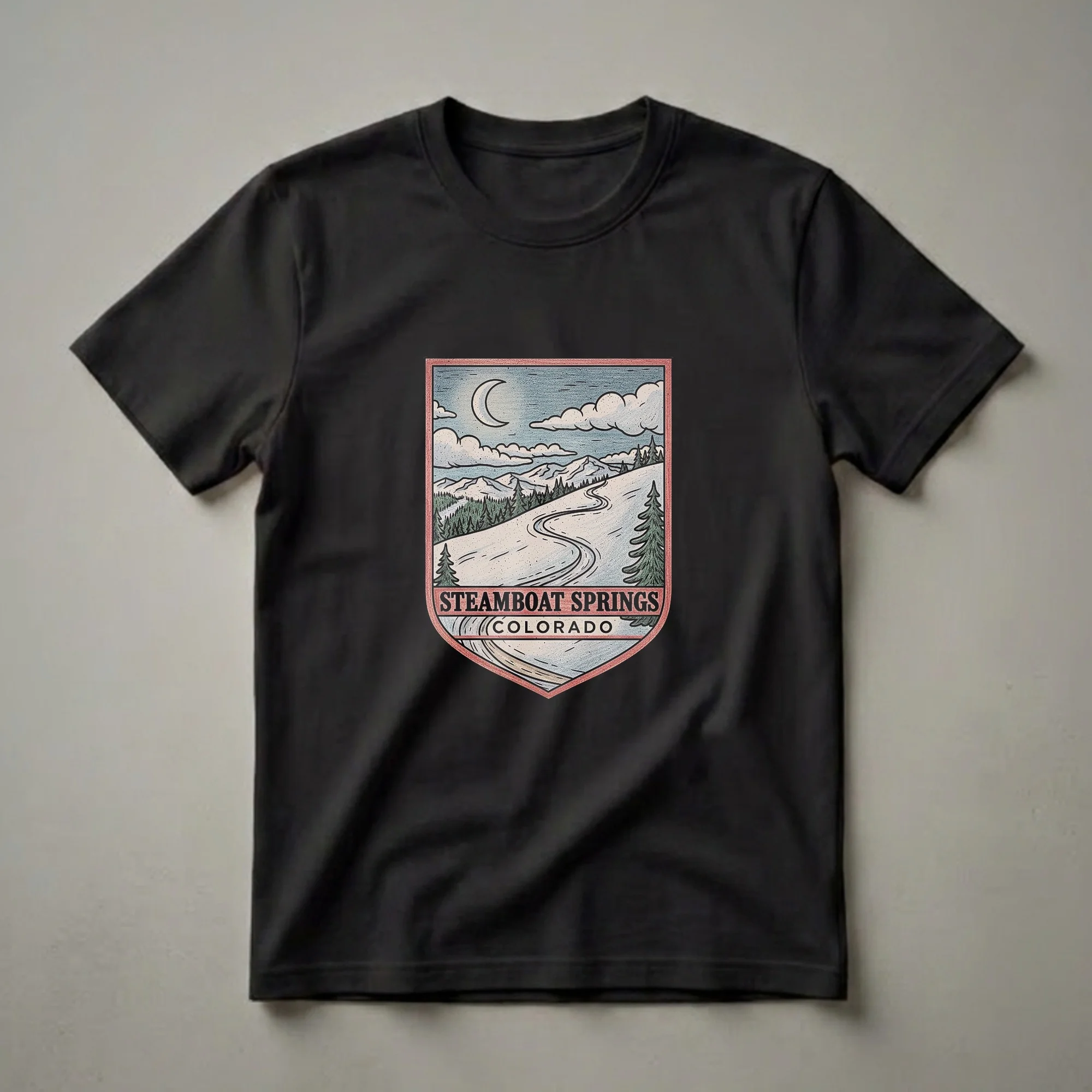 Steamboat Springs, Colorado, is renowned for its abundant snowfall and the legendary "Champagne Powder." This striking graphic tee captures the essence of a winter evening in the Rocky Mountains, featuring a winding road carved into a snowy slope, leading towards majestic, snow-capped peaks. A crescent moon hangs in the twilight sky, accompanied by soft, textured clouds, while evergreen trees dot the landscape. The design is framed within a shield-like crest, with 'STEAMBOAT SPRINGS' prominently displayed above 'COLORADO' in a vintage-inspired font. This shirt is a thoughtful gift for anyone who cherishes the outdoor adventures and breathtaking scenery of Colorado's mountain towns. It's a go-to tee for casual wear, whether you're reminiscing about a ski trip or planning your next adventure. Wear it to a local brewery after a day on the slopes or to a casual gathering with fellow outdoor enthusiasts. This apparel celebrates the unique charm and natural beauty that makes Steamboat Springs a beloved destination for winter sports and mountain living. It's a staple for those who appreciate the rugged, yet serene, allure of the American West.