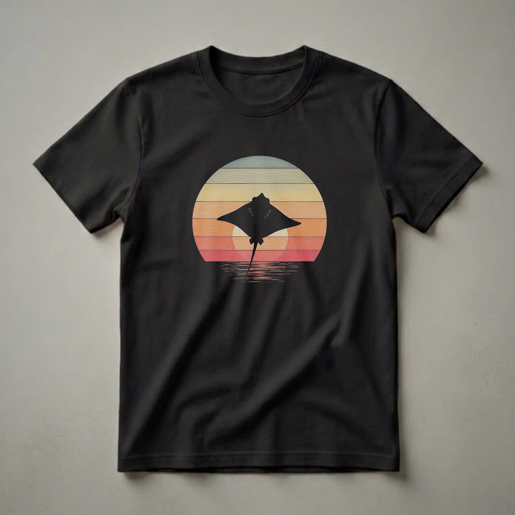 - Retro stingray sunset graphic tee for ocean lovers.