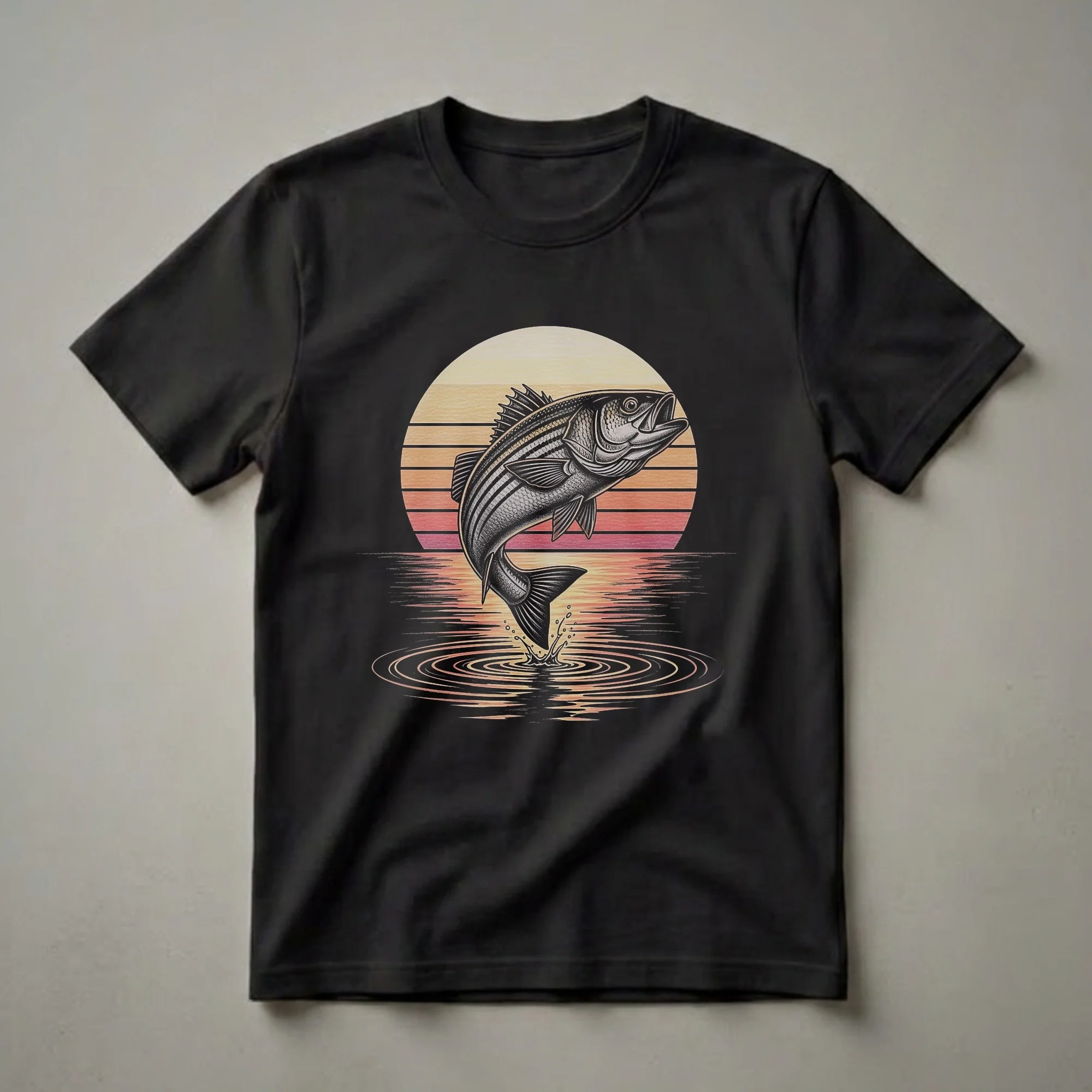 Anglers who appreciate the thrill of the catch will reach for this striking striped bass t-shirt. The design features a detailed, vintage-style illustration of a striped bass leaping from the water. Behind the fish, a retro sunset with horizontal stripes in warm hues of orange, yellow, and red creates a nostalgic backdrop. The water is depicted with dynamic brushstrokes, showing ripples and splashes as the fish breaks the surface. Striped bass, also known as *Morone saxatilis*, are prized game fish found along the Atlantic coast of North America and are known for their powerful runs and aggressive strikes. This graphic tee is a staple for any fishing enthusiast's wardrobe, whether they are casting lines from a boat or the shore. It makes a thoughtful gift for the fisherman or fisherwoman in your life who loves to spend their days by the water. Wear this shirt on your next fishing trip or to your favorite casual outing.