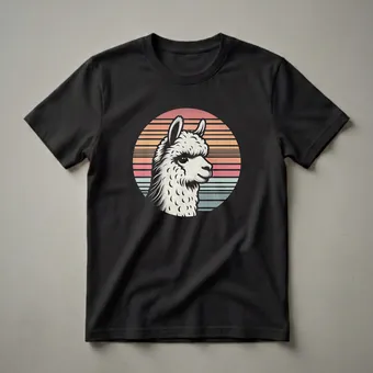 - Features a retro sunset design with a detailed alpaca silhouette.