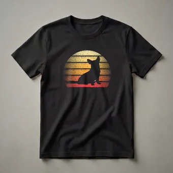Cardigan Welsh Corgi owners who appreciate vintage aesthetics will reach for this eye-catching graphic tee. The design features a striking black silhouette of a Cardigan Welsh Corgi sitting attentively against a vibrant retro sunset. This sunset is rendered with horizontal stripes in warm hues of yellow, orange, and red, all with a distressed, textured finish that evokes a nostalgic, 1980s vibe. The ground beneath the dog is depicted with a similar textured red, suggesting a grassy area. The Cardigan Welsh Corgi, known for its long body and short legs, is one of the two distinct Corgi breeds originating from Wales. This shirt works well for anyone who cherishes their Corgi companion and enjoys retro-inspired apparel. It makes a thoughtful gift for a dog mom or dog dad who wants to display their affection for their furry friend. Wear this tee on casual outings, to dog park visits, or simply while relaxing at home with your beloved pet.