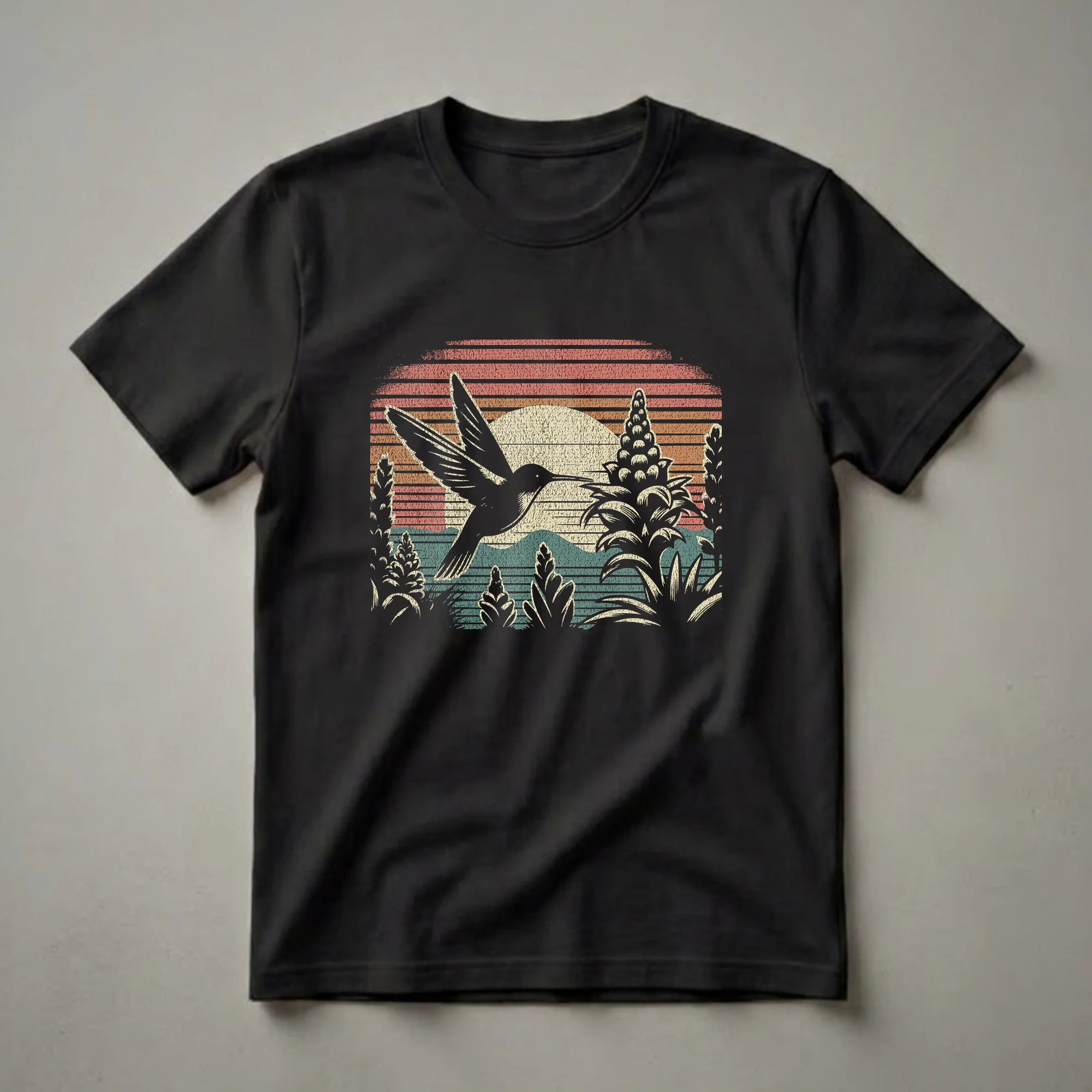 Hummingbird enthusiasts will reach for this striking graphic tee, featuring a detailed silhouette of the tiny bird in mid-flight. The design captures a hummingbird hovering near a flowering plant, its long beak poised to feed. Behind the scene, a stylized retro sunset casts warm hues of orange, red, and yellow across horizontal stripes, with muted blue mountains and green foliage in the mid-ground. This eye-catching t-shirt is a thoughtful gift for anyone who admires these energetic creatures. Hummingbirds are known for their incredible speed and ability to hover, making them a marvel of the avian world. This shirt works well for casual outings, nature walks, or simply relaxing at home while celebrating your passion for these fascinating birds. It's a staple in the collection for any bird lover. Their rapid wing beats, often exceeding 50 times per second, allow for their unique hovering capabilities, a true wonder of nature that this apparel celebrates.