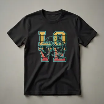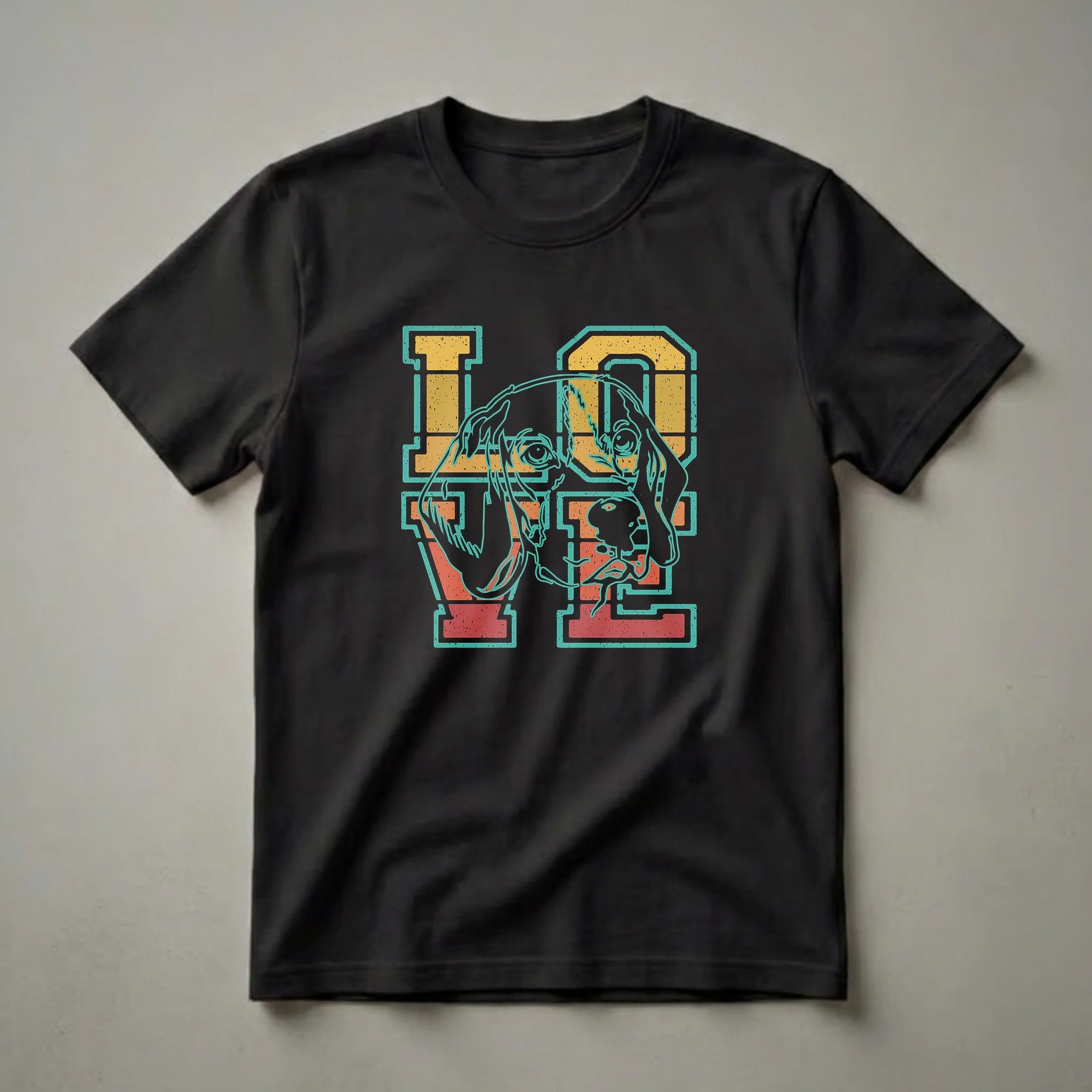 Beagle owners who want to showcase their affection for their four-legged companions will reach for this eye-catching graphic tee. The design features a stylized illustration of a Beagle's face, rendered in a bold outline, seamlessly integrated into distressed, retro-style lettering that spells out 'LOVE'. The color palette evokes a vintage sunset, with warm oranges, yellows, and a striking teal outline, all set against a distressed texture that adds to its throwback appeal. Beagles, known for their merry disposition and keen sense of smell, are a beloved breed, often recognized by their distinctive baying bark and floppy ears. This shirt is a thoughtful gift for any Beagle mom or dad, celebrating the unique bond they share with their canine family member. Wear this comfortable tee to your next dog park visit, a casual brunch with fellow dog lovers, or simply while relaxing at home with your beloved Beagle by your side. It's a staple in the collection for anyone who cherishes their Beagle.