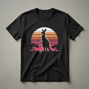 Australian wildlife enthusiasts will appreciate this striking graphic tee featuring a bold black silhouette of a kangaroo against a vibrant retro sunset. The design showcases the iconic marsupial in its natural habitat, with silhouetted acacia trees and grasses adding depth to the scene. Kangaroos are known for their powerful hind legs and ability to hop at high speeds, covering vast distances across the Australian outback. This shirt captures the spirit of adventure and the unique beauty of the Australian landscape. It's a go-to tee for anyone who admires these fascinating creatures or enjoys vintage-inspired art. This t-shirt makes a thoughtful gift for friends or family members who have a passion for animals, travel, or retro aesthetics. Wear it on your next nature walk, to a casual outing, or simply when you want to showcase your love for the wild. The eye-catching design is sure to spark conversations and bring a touch of the outback to your wardrobe.