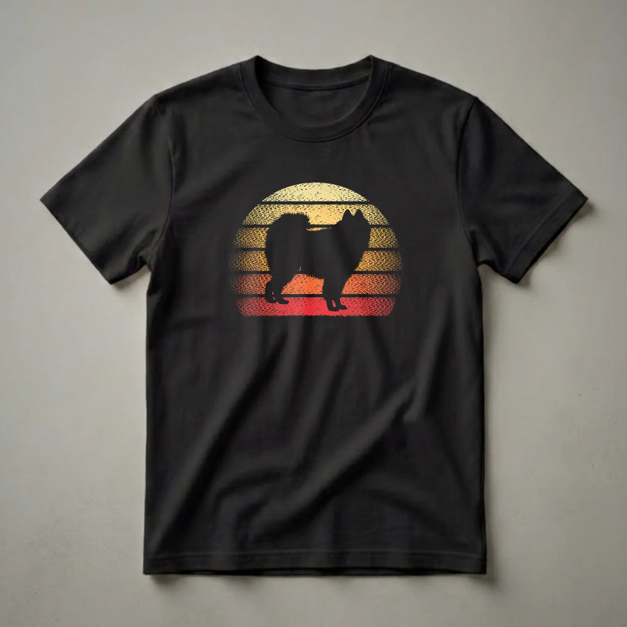 - A vibrant retro sunset design highlights this Samoyed silhouette graphic tee.