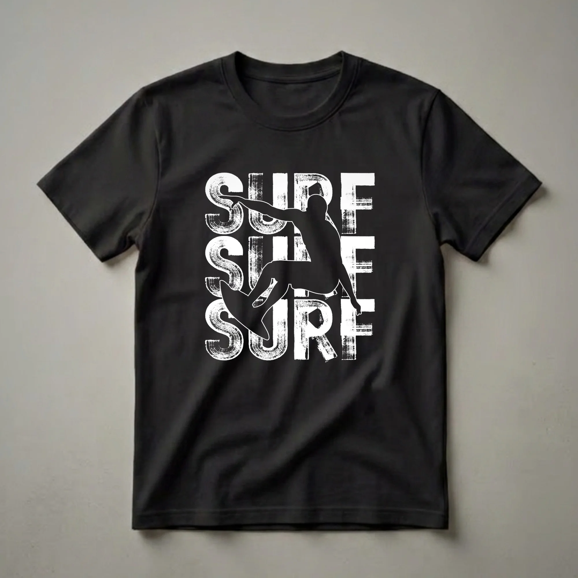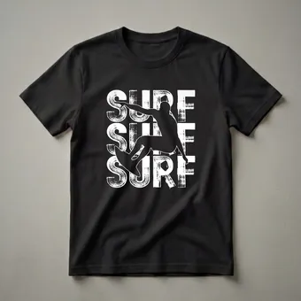 Surfers who live for the thrill of riding the waves will appreciate this striking graphic tee. The design showcases a bold black silhouette of a surfer in action, mid-maneuver on their board. This dynamic figure is dramatically overlaid on three stacked instances of the word 'SURF,' rendered in a distressed, brushstroke-style white font. This visual effect evokes the raw energy and vintage aesthetic of classic surf culture. Surfing, a sport originating in ancient Polynesian culture, has evolved into a global phenomenon, with iconic surf spots found worldwide from the beaches of Hawaii to the coasts of Australia. This t-shirt works well for anyone who dreams of catching the perfect wave or spends their weekends by the ocean. It makes a thoughtful gift for the surfer in your life, whether they are a seasoned pro or a beginner just learning to paddle out. Wear this shirt to the beach, to a casual gathering with friends, or while watching surf competitions to show your passion for the sport.