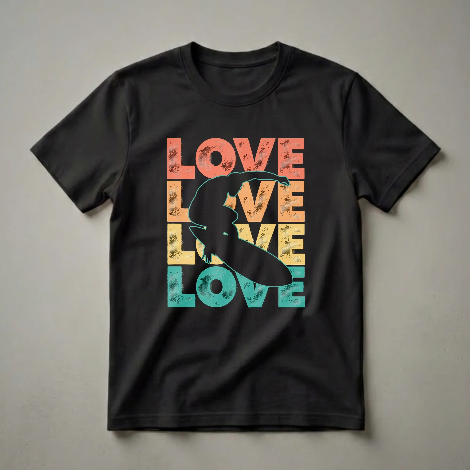 Surfers who live for the thrill of catching a wave will appreciate this eye-catching graphic tee. The design features a bold, black silhouette of a surfer in action, skillfully riding a wave. This dynamic image is layered over stacked words that spell out 'LOVE' in a distinct retro font. The colors used for the 'LOVE' text, coral, orange, yellow, and teal, evoke a vintage, sun-drenched aesthetic, reminiscent of classic surf posters and apparel. Surfing, a sport that originated in ancient Polynesia, requires balance, strength, and a deep connection with the ocean. This t-shirt captures that passion, making it a staple in the collection for anyone who feels the call of the sea. It's a thoughtful gift for the surfer in your life, or for anyone who loves beach culture and retro vibes. Wear this shirt to your next beach outing, surf competition, or casual day out to showcase your love for the sport and the ocean.