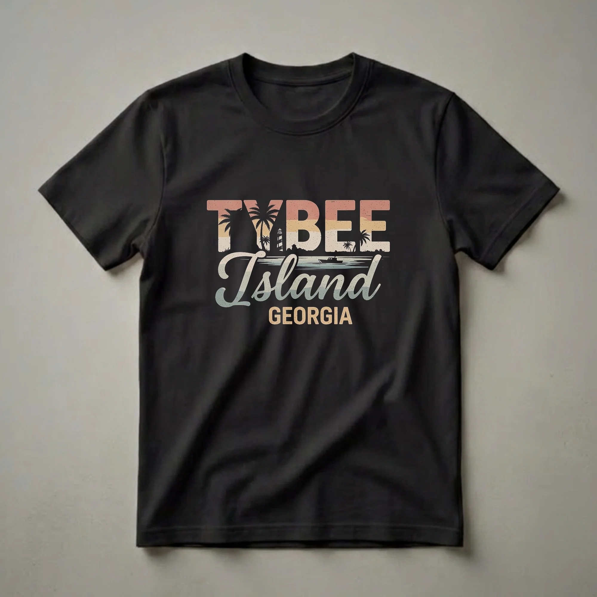 Tybee Island, Georgia, a barrier island east of Savannah, beckons with its coastal charm and laid-back atmosphere. This retro-inspired graphic tee showcases the essence of the island with a vibrant sunset design. Bold, distressed lettering spells out 'TYBEE Island GEORGIA,' set against a backdrop of layered retro colors representing the sky. Silhouetted palm trees, a classic lighthouse, and a small boat on the water evoke the quintessential beach vacation experience. The Tybee Island Light Station, Georgia's oldest and tallest lighthouse, stands as a prominent landmark, guiding ships and visitors alike. This t-shirt is a thoughtful gift for anyone who cherishes their time spent on Tybee's shores, whether they are locals, frequent visitors, or planning their next getaway. It's a staple in the collection for those who love the Georgia coast. Wear this comfortable tee to relive your favorite beach moments, from sunrise strolls to sunset cruises, or simply as a reminder of the island's unique allure. It's a go-to tee for casual outings or relaxing days by the sea.