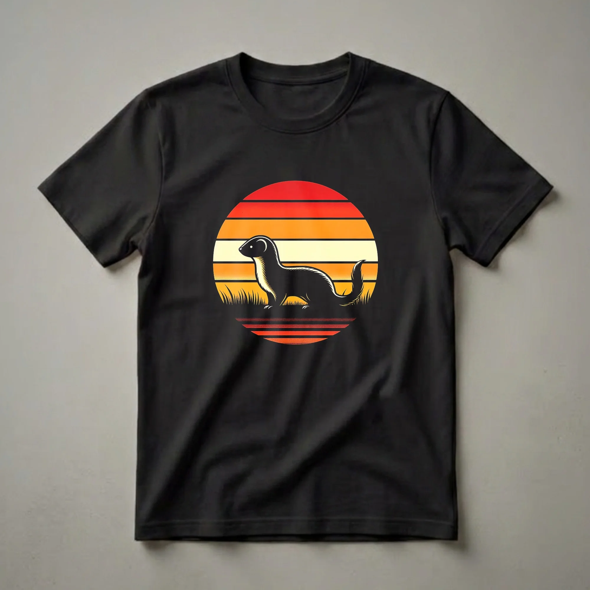 Weasel lovers will reach for this striking graphic tee, featuring a bold silhouette of the agile mammal against a vibrant retro sunset. The design captures the essence of a weasel, known for its slender body and quick movements, set against a backdrop of warm, striped hues reminiscent of a classic 1980s aesthetic. Weasels, belonging to the Mustelidae family, are found across diverse habitats worldwide, from forests to grasslands, and are recognized for their predatory prowess and adaptability. This shirt is a thoughtful gift for anyone who admires these fascinating creatures or enjoys vintage-inspired animal art. It works well for casual outings, nature walks, or simply relaxing at home. The graphic tee offers a unique way to express a passion for wildlife and retro style, making it a standout piece in any casual wardrobe. This t-shirt is a conversation starter for those who appreciate the wild beauty of animals and their unique place in nature.