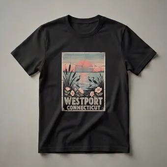 Westport, Connecticut residents and visitors can now wear their love for this charming coastal town with this retro graphic t-shirt. The design showcases a serene sunset over the water, a common sight along the Long Island Sound. Three elegant herons stand in the shallow water, their silhouettes stark against the pastel hues of the sky and water. Delicate pink flowers bloom in the foreground, adding a touch of natural beauty to the scene. The words 'WESTPORT CONNECTICUT' are prominently displayed in a vintage-inspired font, evoking a sense of nostalgia. This tee is a thoughtful gift for anyone who has fond memories of Westport, whether they are a lifelong resident, a frequent visitor, or simply appreciate its picturesque New England landscape. Wear this shirt to a casual outing, a visit to the beach, or while exploring the town's unique shops and restaurants. It's a staple in the collection for anyone wanting to showcase their connection to this vibrant Connecticut community. The design itself is reminiscent of vintage travel posters, making it a unique piece of apparel.
