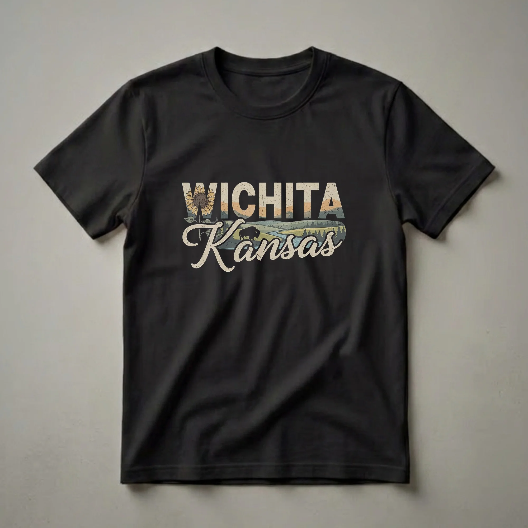 Wichita, Kansas residents and former inhabitants can proudly display their connection to the Sunflower State with this retro-inspired graphic t-shirt. The design showcases the iconic wordmark 'Wichita Kansas' in a distressed, vintage style. Integrated into the lettering is a vibrant sunflower, symbolizing Kansas's official state flower, which blooms across the plains. Below the text, a scenic landscape unfolds, depicting rolling hills and a winding river, reminiscent of the Flint Hills region that borders Wichita. A silhouette of a bison, a creature historically significant to the Great Plains, stands as a testament to the area's heritage. This tee works well for anyone who calls Wichita home or has fond memories of the city. It makes a thoughtful gift for friends and family who appreciate Kansas pride and vintage aesthetics. Wear this shirt to local events, casual outings, or while exploring the beauty of the central plains. This shirt is a great way to celebrate your roots.