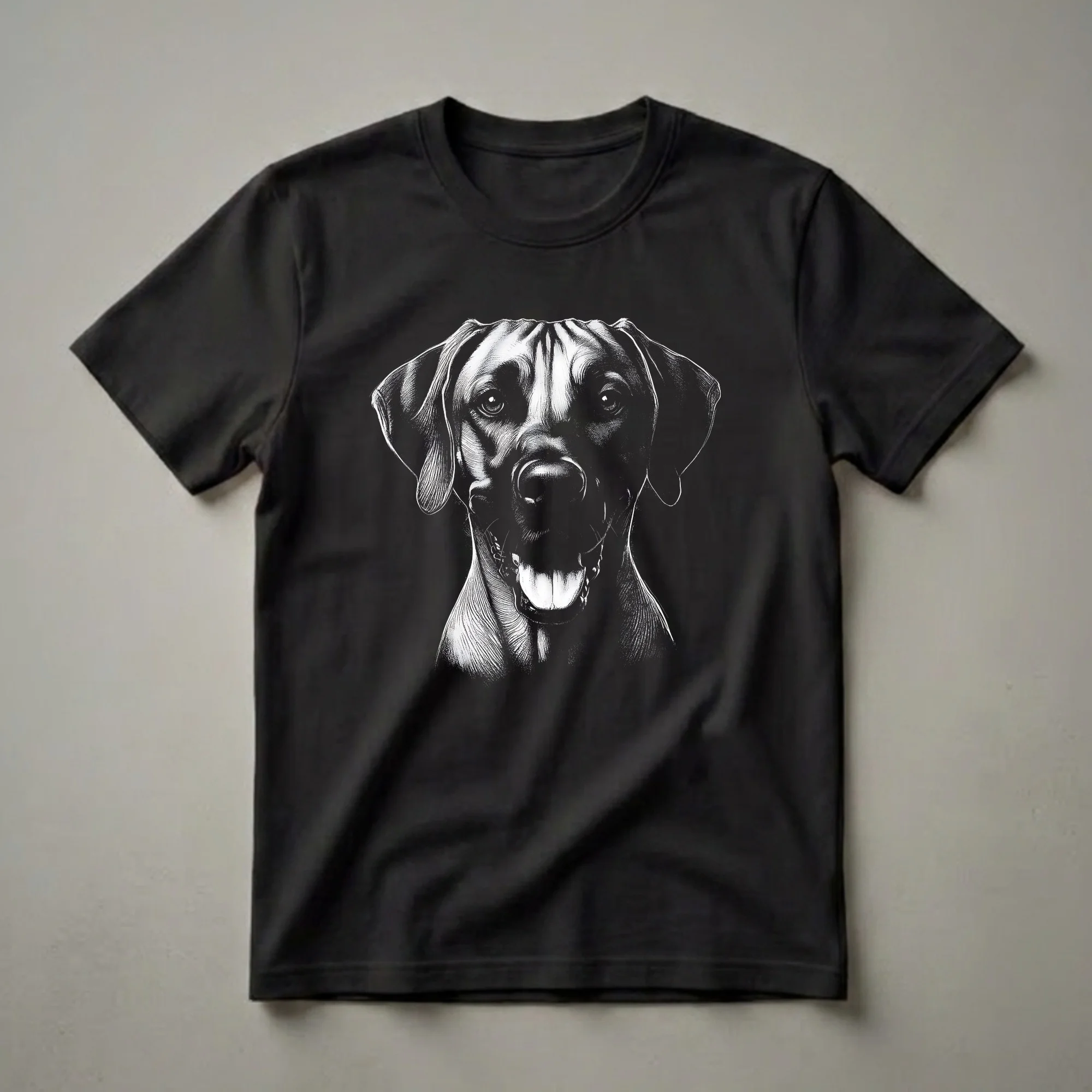 Rhodesian Ridgeback owners know the distinctive character of this breed, often recognized for its athleticism and loyalty. This graphic tee features a detailed black and white sketch of a Rhodesian Ridgeback's face, capturing its alert expression and characteristic features. The art style uses strong linework to define the dog's features, from its expressive eyes and floppy ears to its panting mouth with a visible tongue. Rhodesian Ridgebacks, originally bred in Southern Africa for hunting lions, possess a unique history and a powerful presence. This shirt is a fantastic way for any man or woman who cherishes this breed to express their passion. It makes a thoughtful gift for a Rhodesian Ridgeback mom or dad, a thoughtful choice for casual outings or simply relaxing at home. Wear this eye-catching shirt to show off your favorite canine companion.