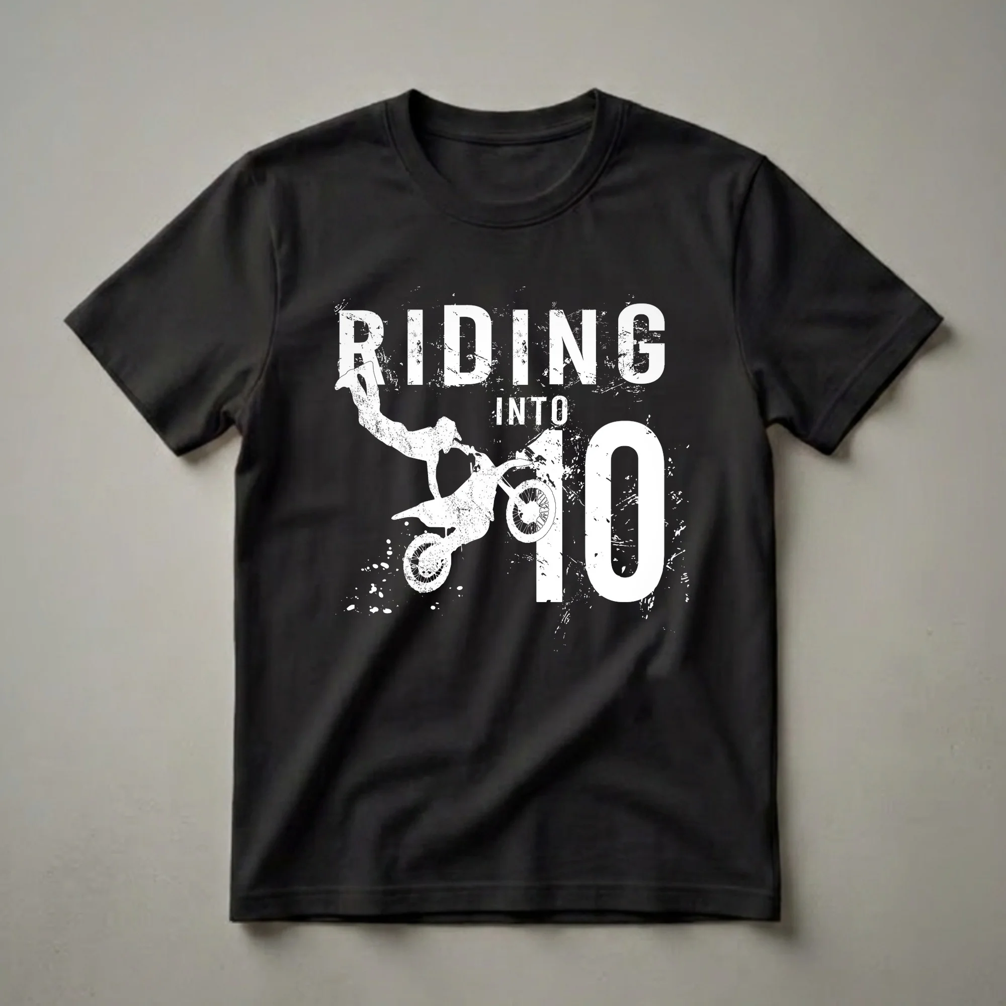 Ten-year-old boys who dream of hitting the motocross track will love this graphic tee. The design features a dynamic white silhouette of a dirt bike rider mid-air, performing a jump. Bold white lettering announces "RIDING INTO 10" with a distressed, grunge-like texture overlaying the entire graphic and the black background. This shirt is a fantastic way for any young motocross enthusiast to celebrate their tenth birthday. Dirt biking is a sport that requires skill, balance, and courage, making it an exciting passion for many pre-teens. This t-shirt captures that adventurous spirit. It's a thoughtful gift for a son, grandson, nephew, or any boy turning ten who has a passion for speed and off-road adventures. Imagine him wearing this shirt to his birthday party or out riding his own bike. This tee is a staple for any young rider's wardrobe, celebrating a significant milestone year with an action-packed design. This shirt truly embodies the thrill of the sport.