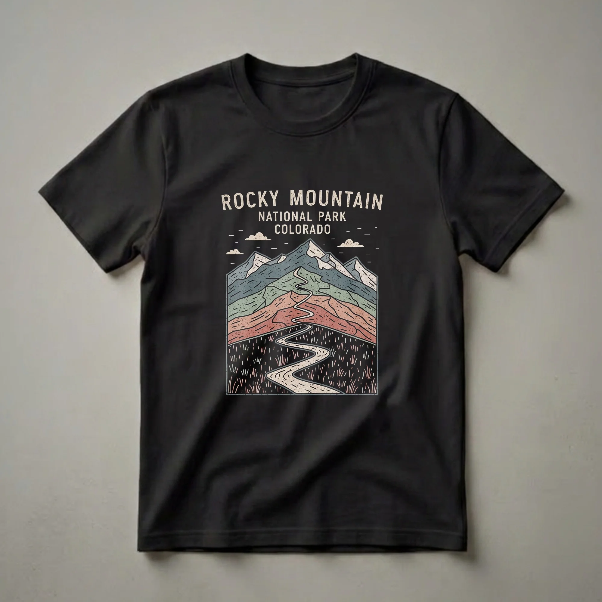 Outdoor enthusiasts and hikers who dream of Colorado's majestic peaks will reach for this retro graphic tee. The design features a stylized depiction of Rocky Mountain National Park, showcasing its layered mountains in muted tones of blue, green, and rust. A winding, light-colored road snakes through the landscape, inviting the viewer to imagine a scenic drive or hike through the park's breathtaking terrain. The foreground is dotted with abstract representations of grass and foliage, adding to the vintage aesthetic. Above the mountains, a few stylized clouds drift across the dark background, completing the scene. Rocky Mountain National Park, established in 1915, is renowned for its diverse ecosystems, from montane forests to alpine tundra, and is a popular destination for its scenic drives like Trail Ridge Road, which offers unparalleled views. This t-shirt is a thoughtful gift for anyone who has experienced the grandeur of this national treasure or plans to visit. Wear it on your next camping trip, hike, or casual outing to carry a piece of Colorado's natural beauty with you.