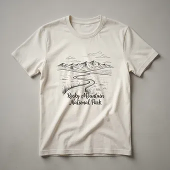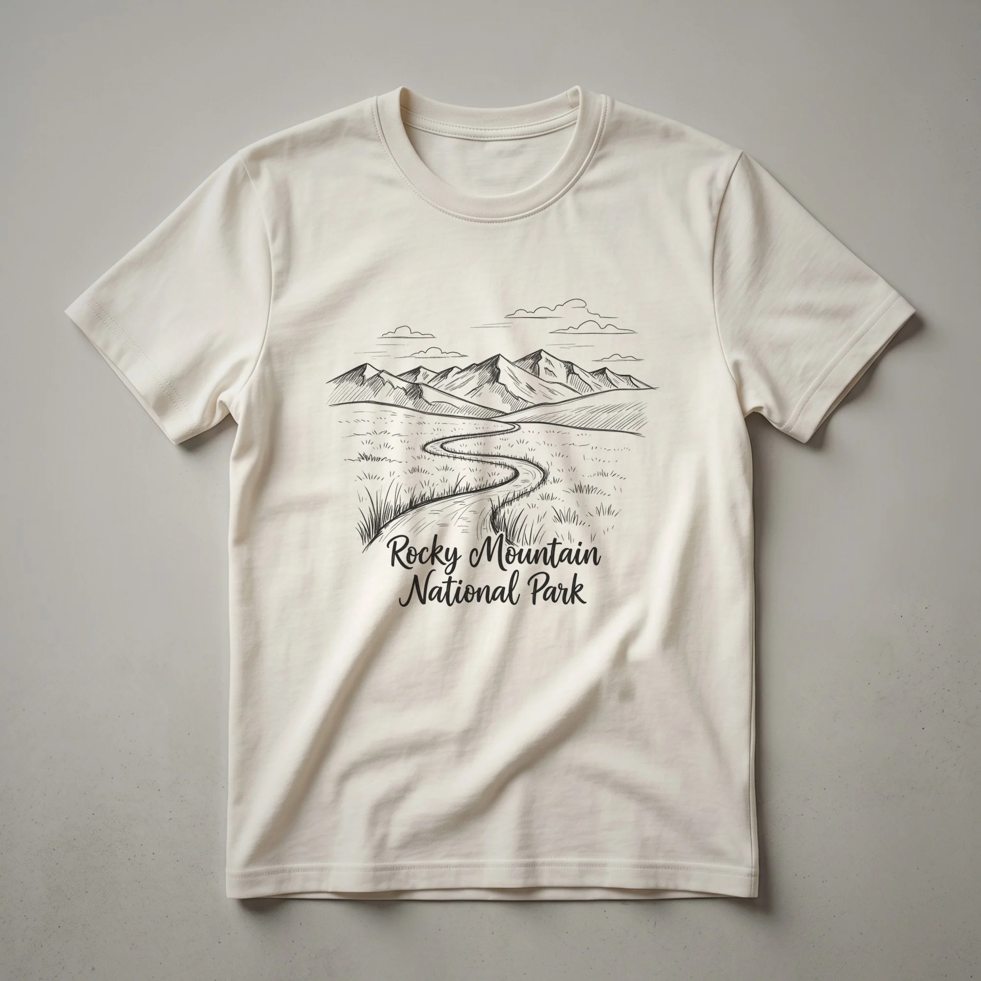 Rocky Mountain National Park in Colorado beckons with its majestic peaks and scenic byways, captured here in a striking sketch-style graphic. This t-shirt features a winding path leading through grassy terrain towards a dramatic mountain range under a cloudy sky, evoking the spirit of adventure and exploration. The text 'Rocky Mountain National Park' is elegantly rendered in a script font, grounding the design in its iconic location. Rocky Mountain National Park is renowned for its diverse ecosystems, from montane forests to alpine tundra, and is a popular destination for hiking, camping, and wildlife viewing. This shirt is for anyone who has experienced the awe-inspiring beauty of this natural wonder or dreams of visiting. It makes a thoughtful gift for hikers, campers, or anyone who cherishes the great outdoors and wants to carry a piece of Colorado's grandeur with them. Wear this tee on your next trail adventure or as a reminder of your favorite national park.