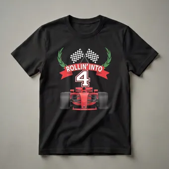 Four-year-old boys who dream of the roar of engines and the thrill of the race will love this vibrant racing-themed birthday shirt. The graphic prominently features a sleek, red Formula 1-style race car, symbolizing speed and excitement. Above the car, a red banner proudly proclaims 'ROLLIN' INTO 4' in bold white lettering, signifying the milestone birthday. Two crossed checkered flags, a universal symbol of racing victory, are positioned above the banner, framed by a green laurel wreath, adding a touch of championship flair. This eye-catching t-shirt is worn by the birthday boy who is turning four and has a passion for all things automotive and fast-paced. It makes a thoughtful gift for any young enthusiast eager to celebrate their big day in style. Imagine him wearing this tee to his birthday party, feeling like a true race car driver as he celebrates turning four. This shirt is a fantastic way for any four-year-old boy to showcase his excitement for his birthday and his love for racing.