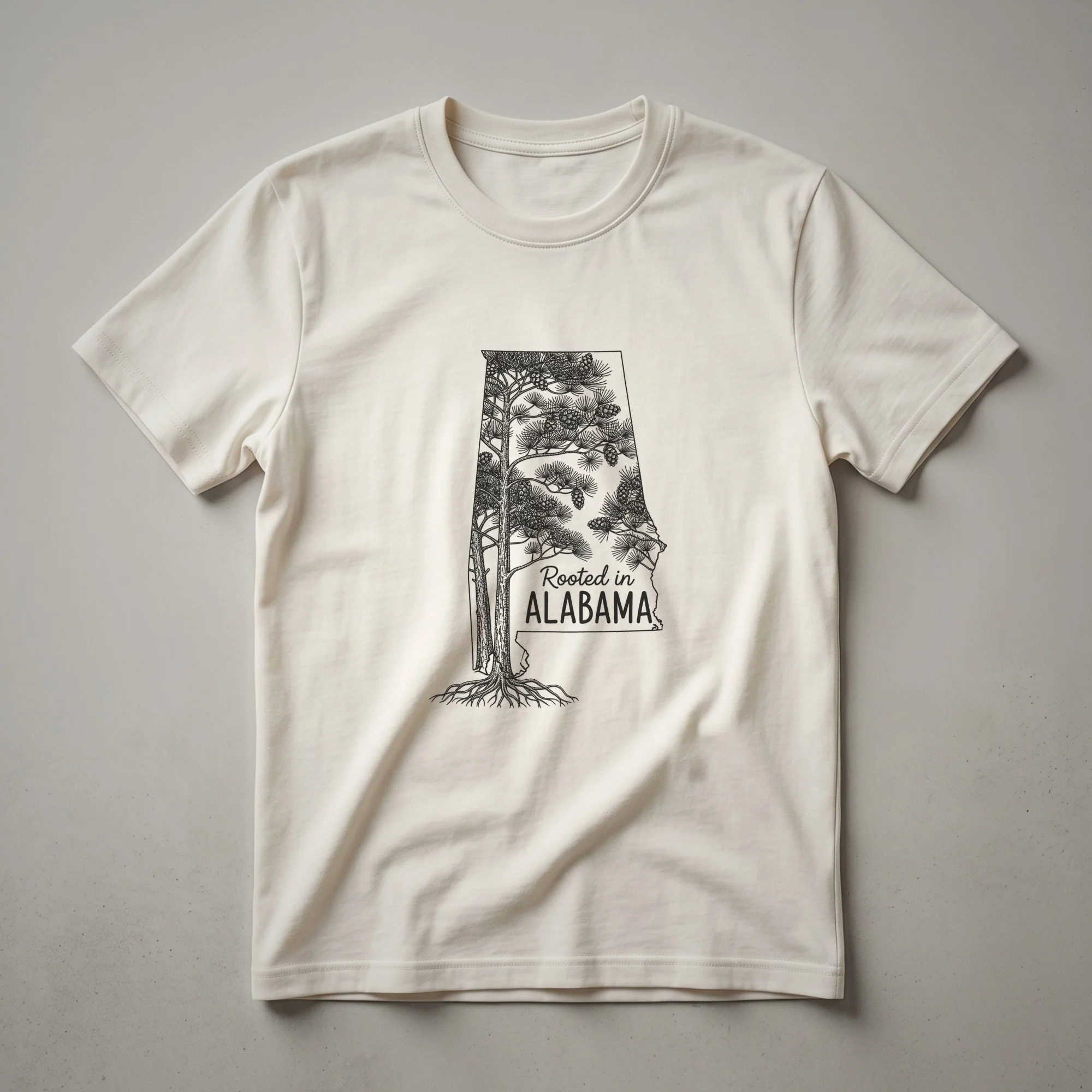 Alabamians who want to showcase their deep connection to the state will reach for this distinctive graphic tee. The design features a detailed line art illustration of a pine tree, complete with cones and intricate roots, artfully placed within the outline of Alabama. Pine trees, particularly species like the Loblolly pine, are prevalent throughout the state, contributing to its rich natural landscape and timber industry. This shirt serves as a visual representation of that enduring connection. It's a staple in the collection for anyone who calls Alabama home or holds fond memories of the state. This tee works well for casual outings, family gatherings, or simply as a comfortable everyday shirt. Looking for a thoughtful gift for the proud Alabamian in your life? This unique t-shirt is a perfect choice, celebrating their roots and state pride with a touch of natural artistry. Wear it to express your heritage and love for the Heart of Dixie.