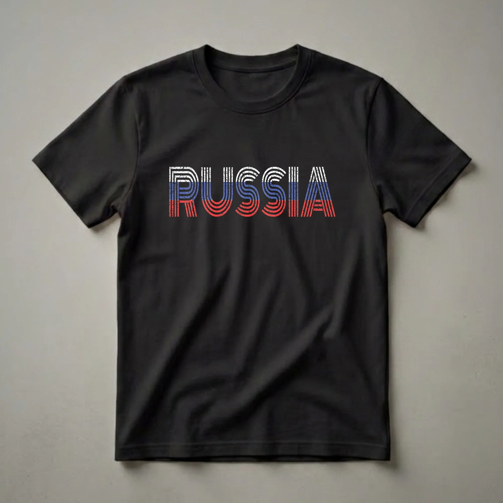 Proudly display your Russian heritage with this striking graphic t-shirt. The word "RUSSIA" is emblazoned across the chest in a bold, retro font, with each letter artfully filled with the iconic white, blue, and red stripes of the Russian flag. A distressed texture adds a vintage feel, making this shirt a unique statement piece. Russia, the largest country in the world by land area, spans Eastern Europe and Northern Asia, boasting a rich history and diverse culture. This tee is a thoughtful gift for any Russian expat, someone with Russian ancestry, or anyone who cherishes their connection to the country. Wear it to cultural events, family gatherings, or simply as a daily expression of national pride. This comfortable shirt is a staple for any wardrobe celebrating Russian identity.
