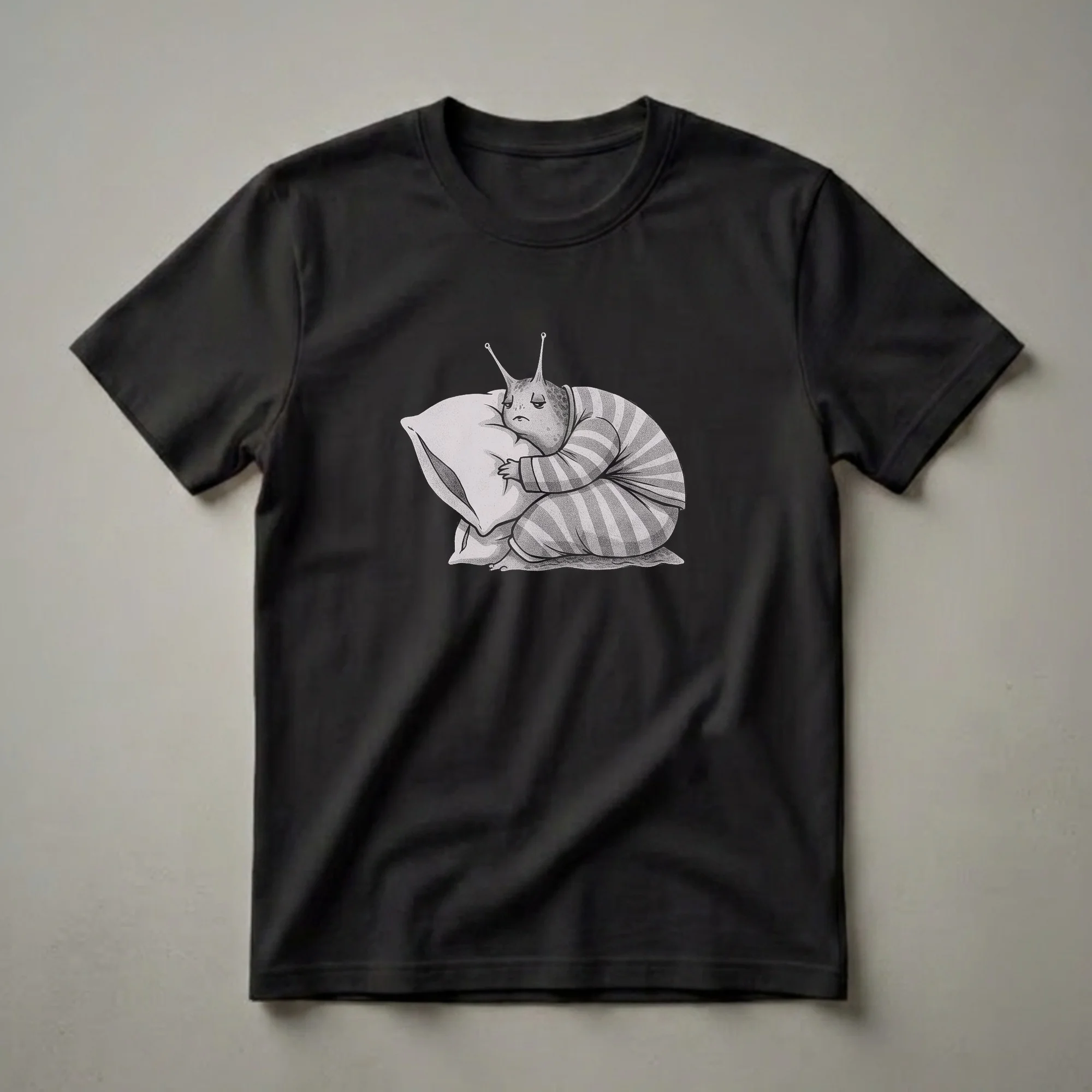Slugs, often overlooked in the natural world, are fascinating gastropod mollusks known for their slow, deliberate movements and their vital role in ecosystems. This unique t-shirt captures a moment of quiet contemplation with a charmingly melancholic slug character. Dressed in striped pajamas and clutching a pillow, the slug embodies a relatable sense of weariness or a desire for rest. The detailed drawing style, rendered in monochrome with a stippled texture, gives the artwork a vintage feel, reminiscent of classic wildlife illustrations. This graphic tee is a thoughtful gift for nature enthusiasts, wildlife artists, or anyone who appreciates quirky, character-driven art. It's a conversation starter that appeals to those who find beauty in the unconventional and celebrate the quiet moments of life. Wear this shirt to express your love for the natural world with a touch of humor and artistic flair, making it a go-to tee for casual outings or relaxing at home. Slugs are essential decomposers, breaking down organic matter and enriching soil, demonstrating their importance even in their slow-paced existence.