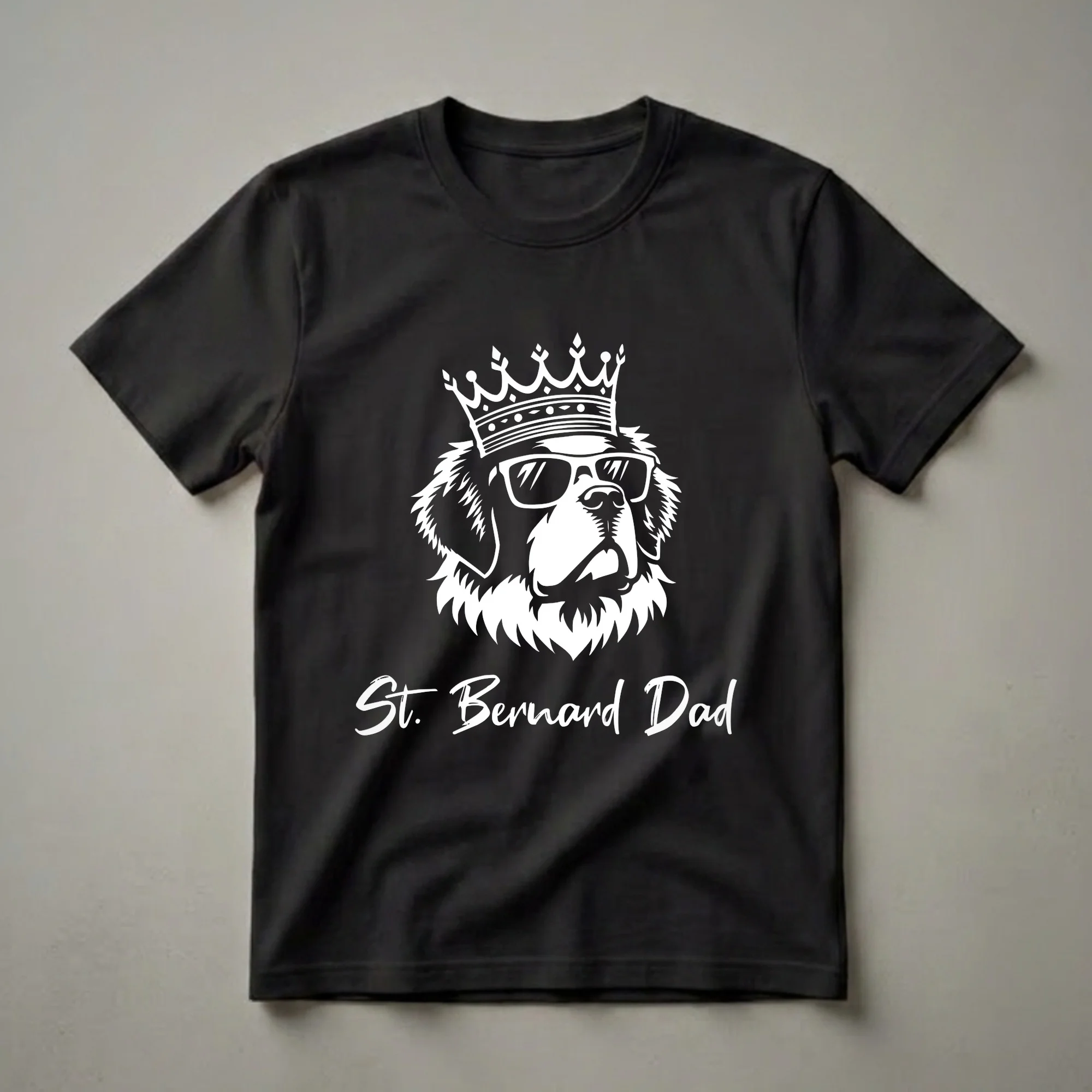 Saint Bernard dads know the joy and responsibility that comes with owning one of these gentle giants. This striking graphic tee captures that spirit with a regal Saint Bernard dog sporting cool sunglasses and a kingly crown. Below the image, the bold script reads 'St. Bernard Dad,' clearly identifying the wearer's proud title. Saint Bernards, originally bred in the Swiss Alps for rescue work, are known for their massive size, calm demeanor, and affectionate nature. This shirt is a fantastic way for any man who loves his Saint Bernard to express his devotion. It makes a thoughtful gift for birthdays, holidays, or just because for the Saint Bernard dad in your life. Wear this unique t-shirt to dog parks, casual outings, or while relaxing at home with your furry companion. It’s a conversation starter and a clear declaration of your status as a devoted Saint Bernard parent. This eye-catching design is sure to be a favorite in any dog lover's wardrobe.