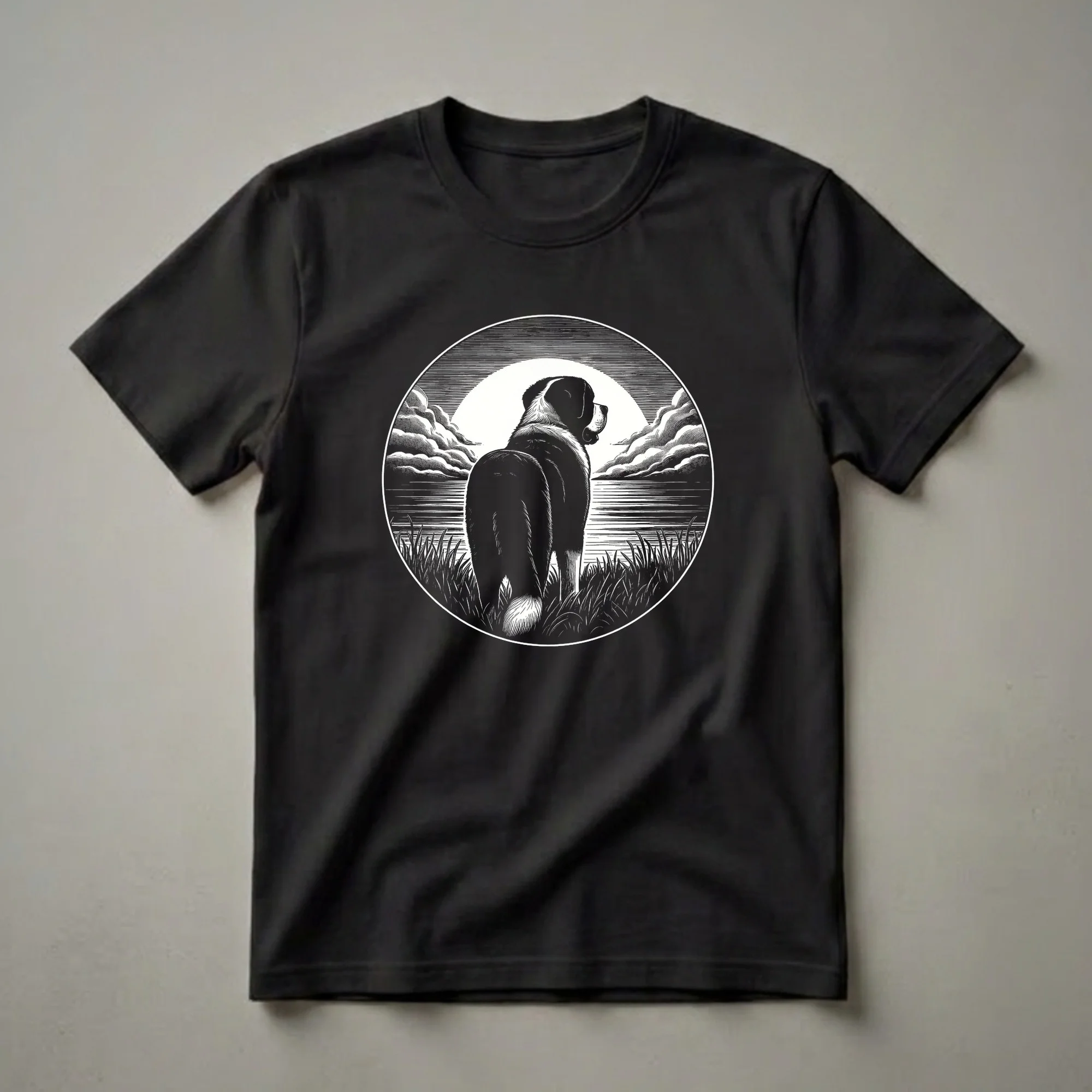 Saint Bernard owners know the breed's gentle giant nature and their history as rescue dogs in the Swiss Alps. This eye-catching t-shirt captures that spirit with a striking woodcut-style graphic. The design features a majestic Saint Bernard standing in tall grass, gazing out at a tranquil body of water under a large, luminous moon and dramatic clouds. The detailed linework evokes a sense of calm and the enduring bond between humans and these magnificent animals. This shirt is a go-to tee for Saint Bernard moms and dads who appreciate unique dog art. It makes a thoughtful gift for anyone who cherishes their large, lovable companion. Wear this tee to your next dog park visit or casual outing and let your Saint Bernard pride shine. The Saint Bernard is known for its calm temperament and impressive size, originally bred for rescue work in the treacherous Great St Bernard Pass.